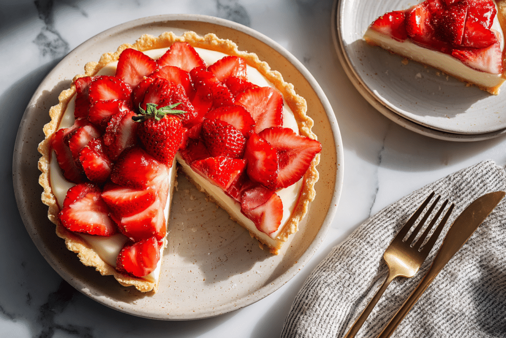 This Homemade Strawberry Tart is a classic elegant dessert featuring a buttery crisp tart shell, silky vanilla cream, and fresh strawberries on top. It looks bakery-fancy but is surprisingly easy …