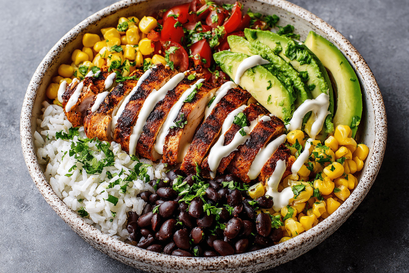 Each bowl offers a rich mix of textures and flavors—from juicy chicken and hearty black beans to cool avocado and crunchy corn. The chipotle marinade adds just the right amount of heat, while the tangy yogurt sauce pulls everything together. This is the kind of meal that fuels your day without feeling like a compromise.