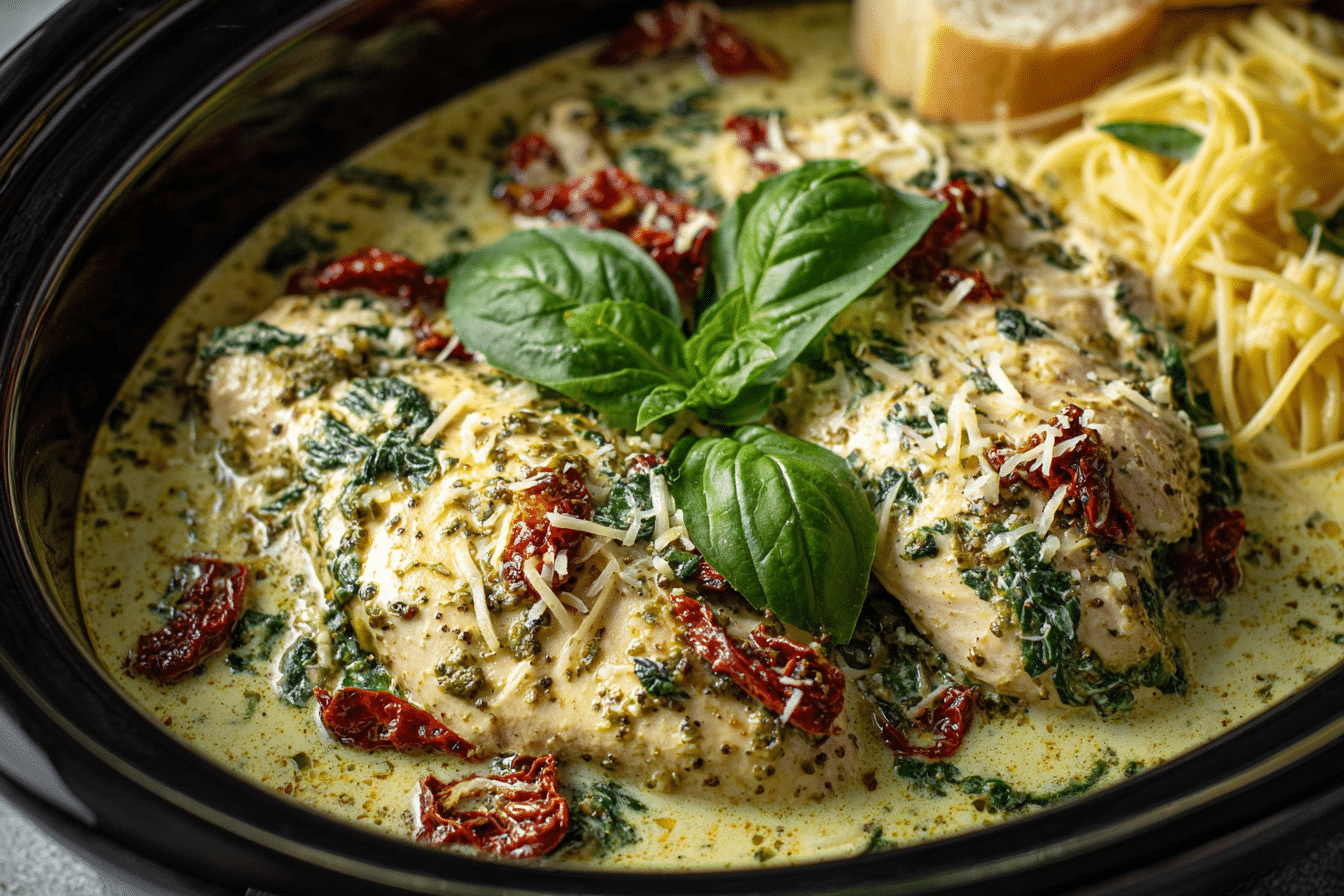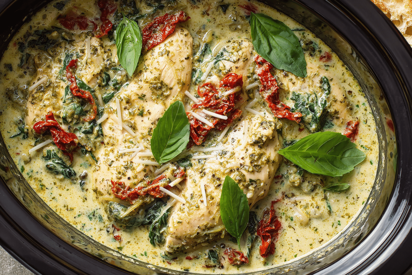 Easy Crockpot Pesto Chicken with Sun-Dried Tomato and Creamy Spinach Sauce is a comforting slow cooker meal that combines rich, herby pesto with tender chicken and a luscious creamy sauce. The slow cooking process allows the chicken to absorb the fragrant basil, garlic, and olive oil flavors from the pesto while the sun-dried tomatoes add a slightly tangy sweetness that balances the richness of the dish.