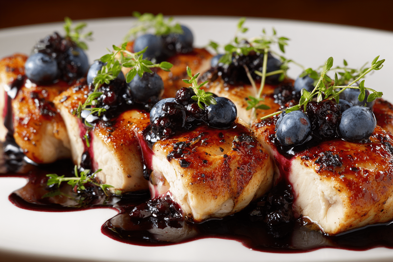 PrintJuicy chicken glazed in a sweet and savory blueberry-thyme sauce with balsamic and garlic. A seasonal, elegant meal ready in 40 minutes.