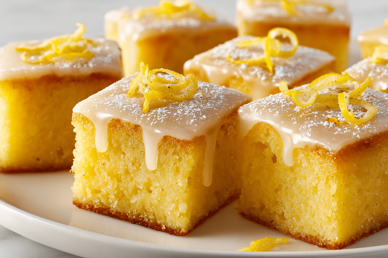 These bars bake into a pale golden slab with slightly chewy edges and a tender center. A thin lemon glaze settles over the surface, adding a delicate crackle and an extra layer of citrus depth. The balance between sweetness and tang keeps every bite refreshing rather than heavy.
