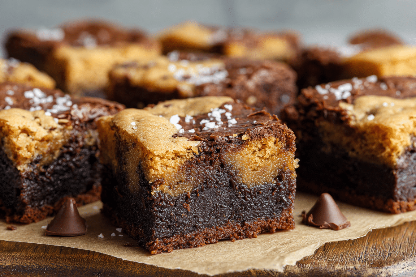 Preheat oven to 350°F (175°C) and line an 8×8″ pan with parchment. Spread brownie batter evenly on the bottom. Drop spoonfuls of cookie dough over the top — try to cover most of the surface so there’s a marbled effect. (Website-Name-Here)