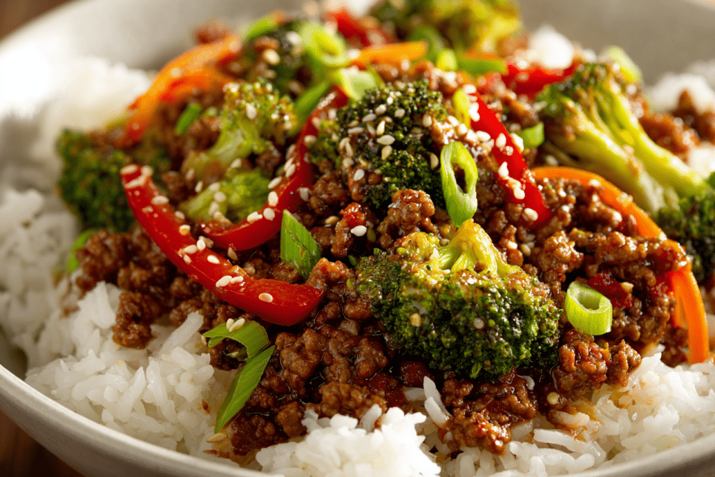 Spicy Ground Beef Stir-Fry Bowl with Garlic Veggies & Steamy Rice