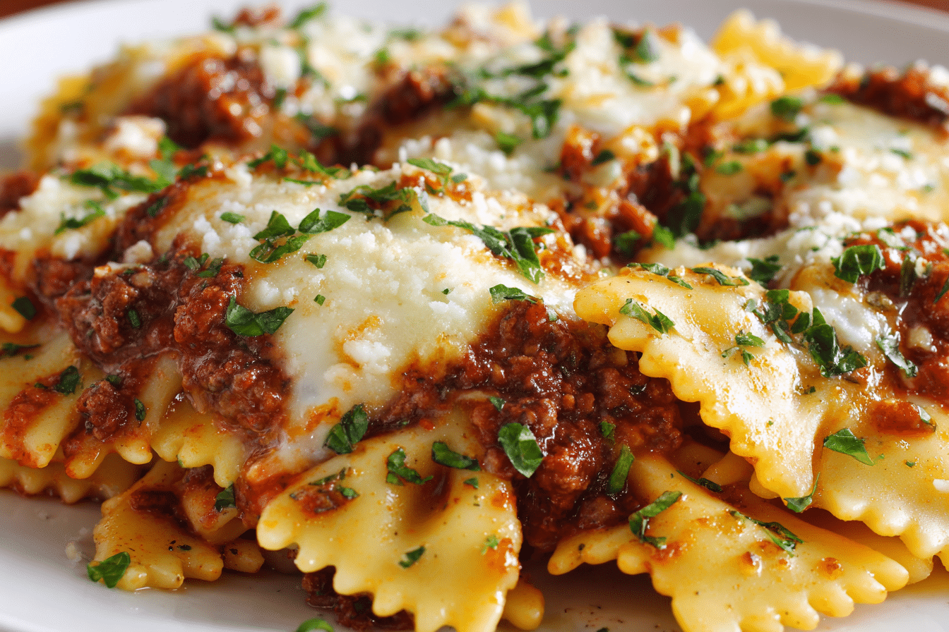 A baked bowtie pasta casserole layered with savory meat sauce, creamy ricotta, and melty mozzarella — a fun and satisfying spin on classic lasagna.