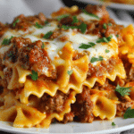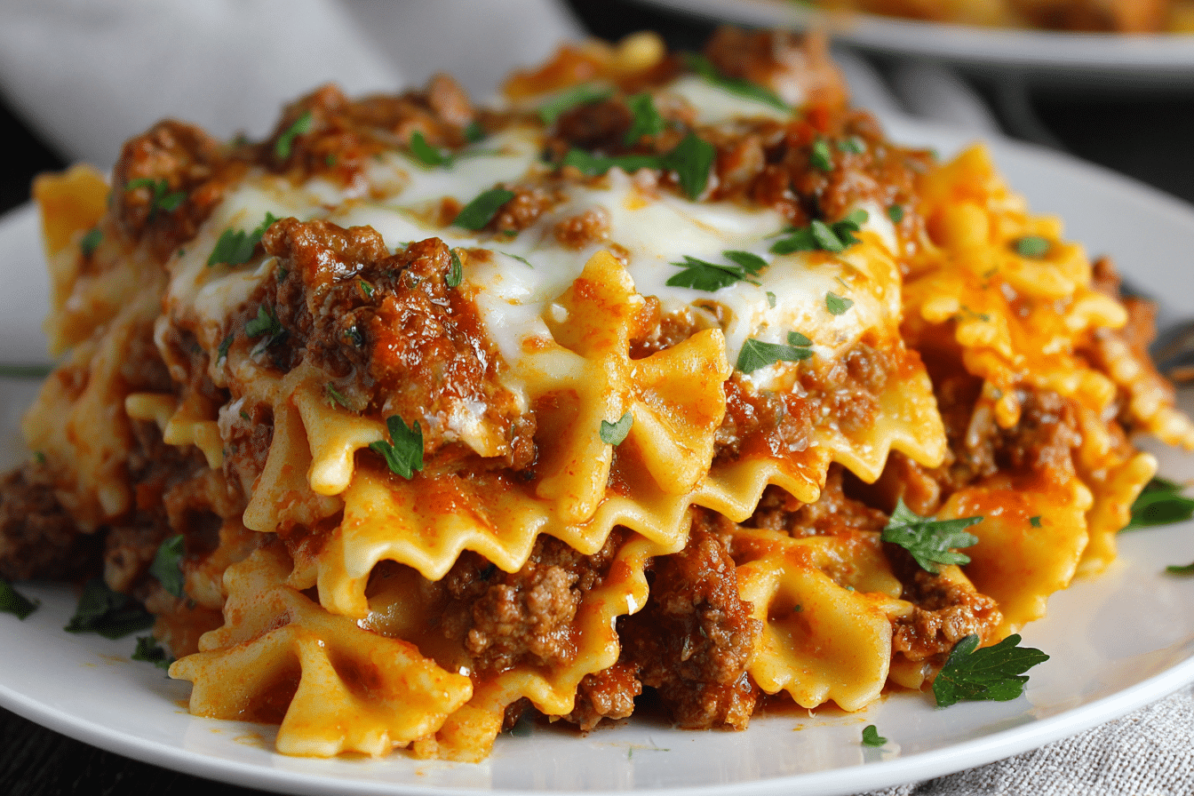This reimagined version uses farfalle—those charming little bowtie-shaped noodles—instead of traditional lasagna sheets. The result is a hearty, rustic casserole that’s just as satisfying but with a more casual, scoopable texture. Each bowtie is coated in flavorful sauce, layered with creamy ricotta, savory ground meat, and bubbling mozzarella, all baked until golden and irresistibly gooey.