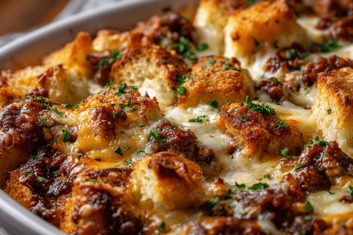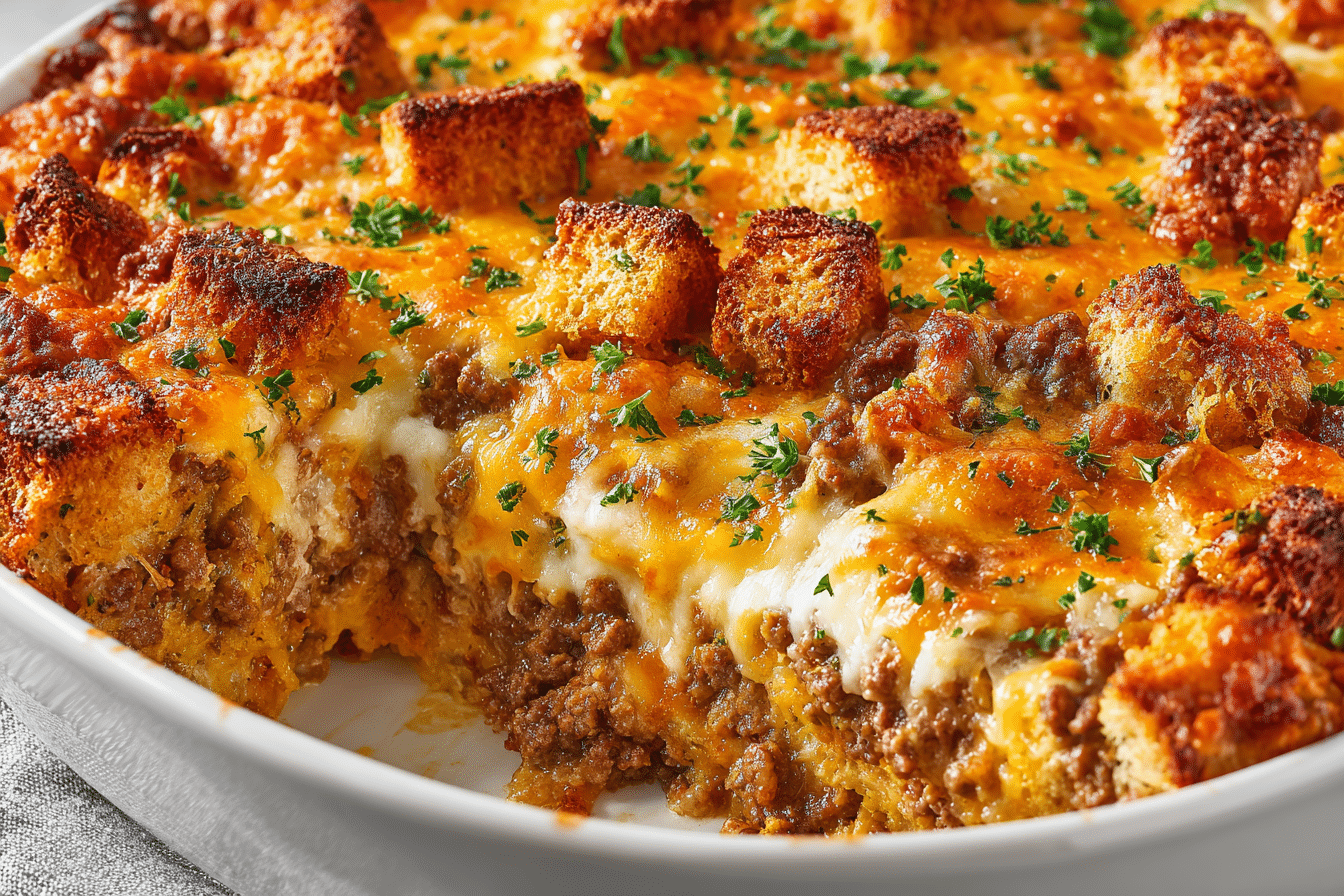 A deliciously layered casserole featuring savory beef, rich tomato sauce, melted cheese, and crispy garlic bread for a full-flavored, comforting twist on the classic cheeseburger.