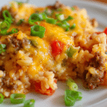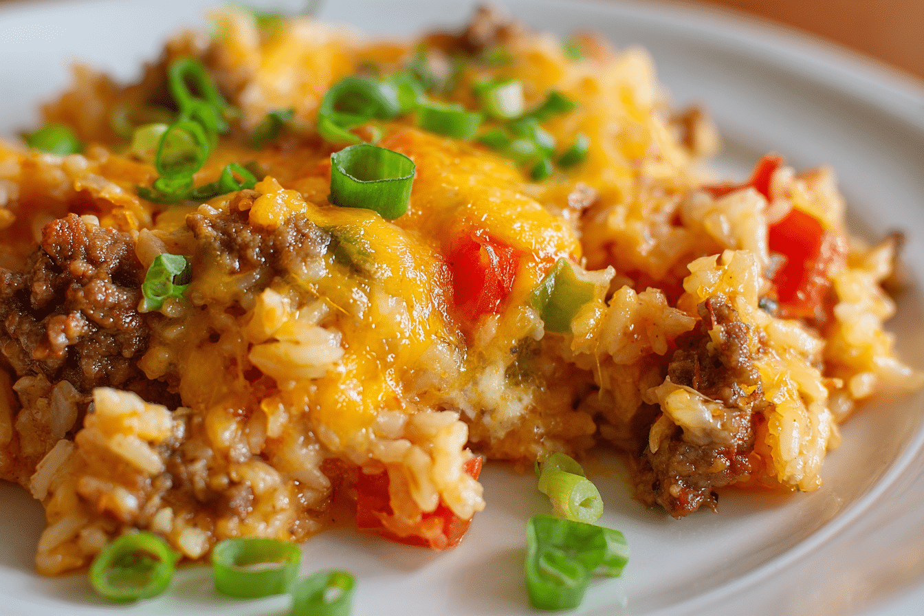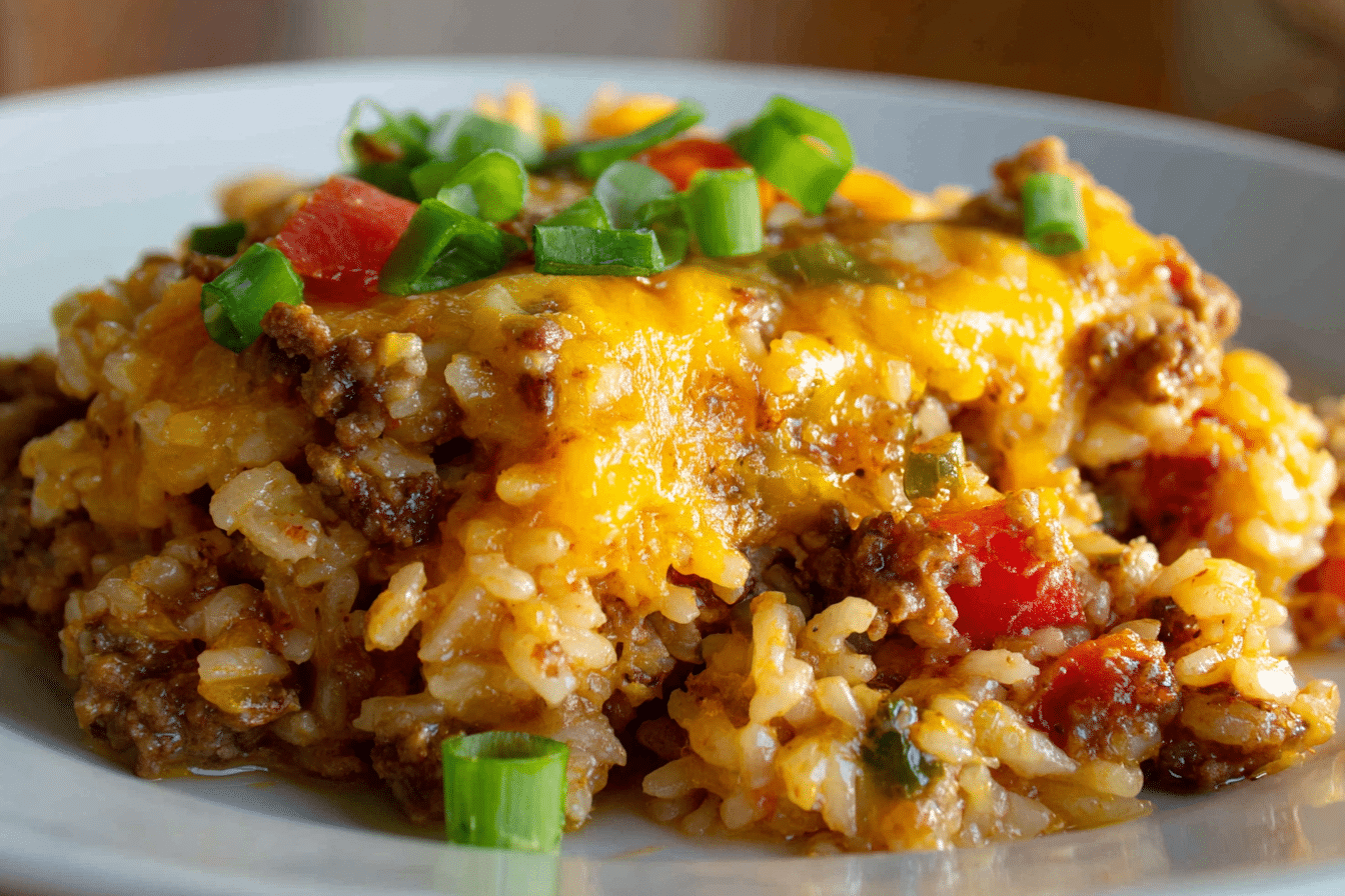 This dish has roots in classic American home cooking—think potlucks, cozy Sunday dinners, and budget-friendly weeknight meals. Combining seasoned ground beef, fluffy rice, and melty cheese in one pan, it’s the kind of recipe that feeds a hungry crowd with minimal fuss.