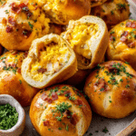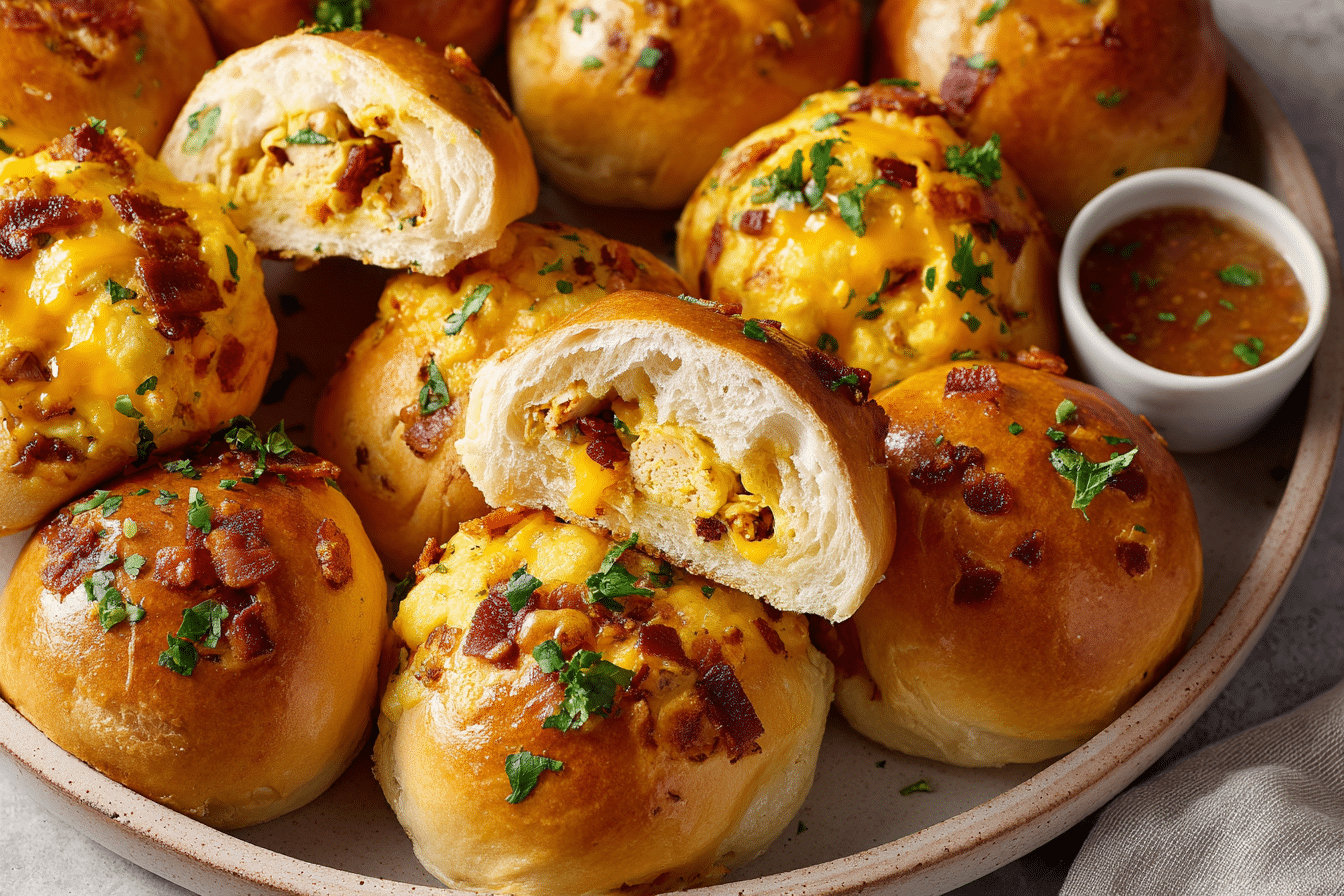 Imagine the aroma of smoky bacon, tender chicken, and melted cheese baked into golden, buttery biscuit dough. Now imagine the soft scramble of creamy eggs tucked into every bite, making each mouthful feel like a full diner breakfast wrapped into one handheld treat.