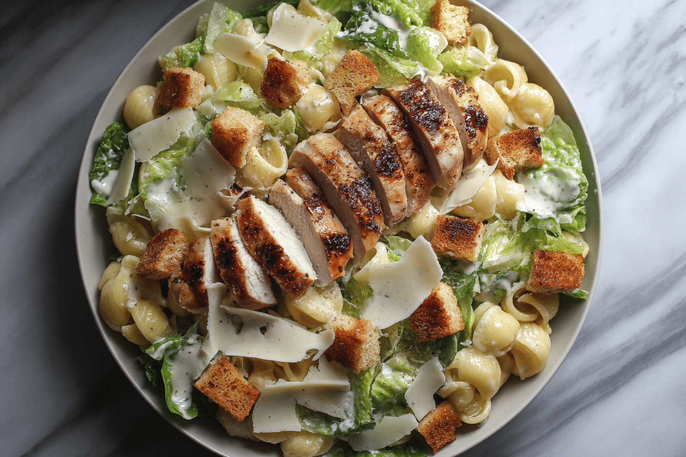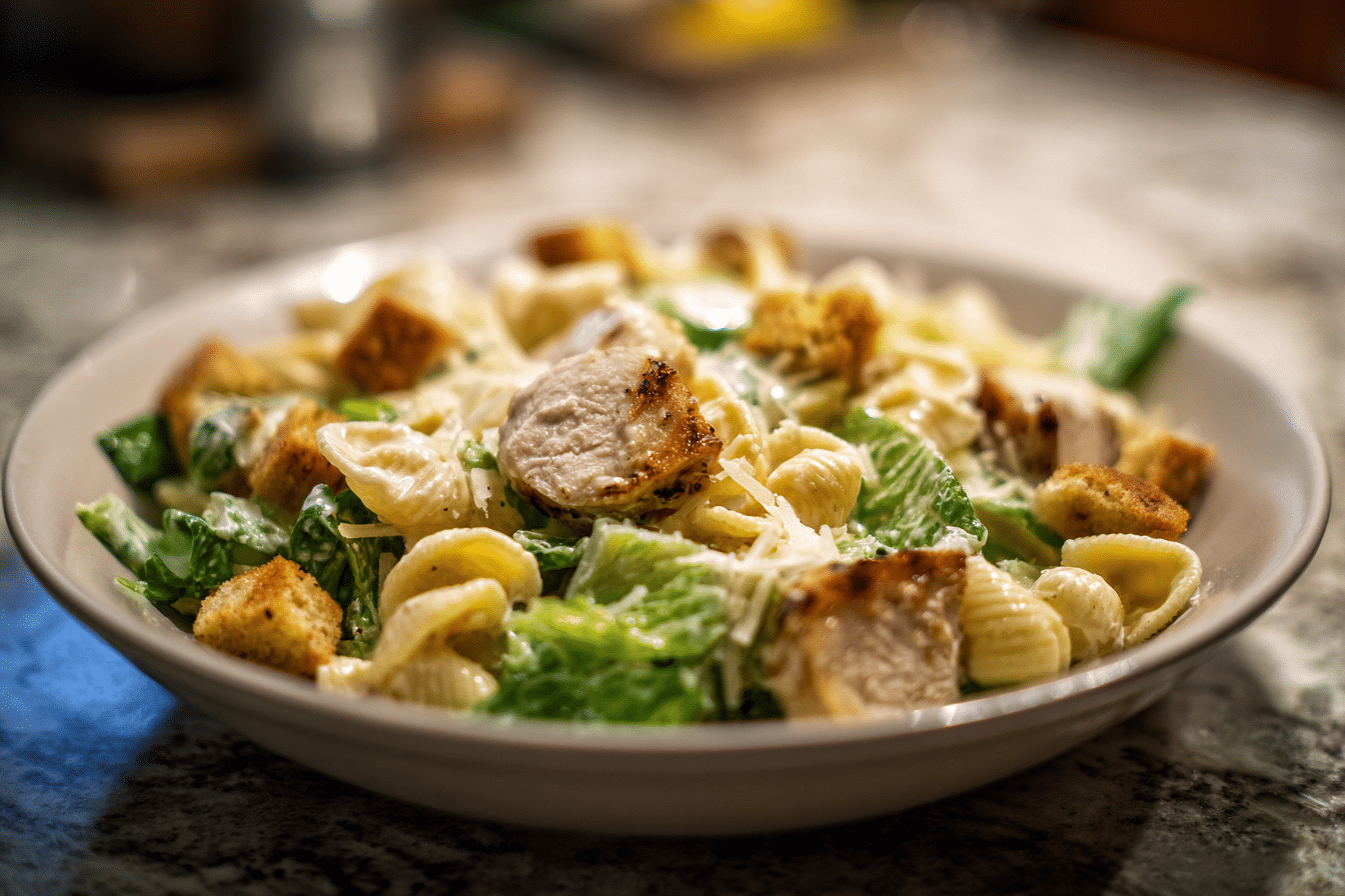 The combination of Caesar dressing, Parmesan cheese, and juicy chicken creates a familiar comfort, while the pasta turns it into something more filling and substantial. Every bite is creamy, crunchy, and satisfying.