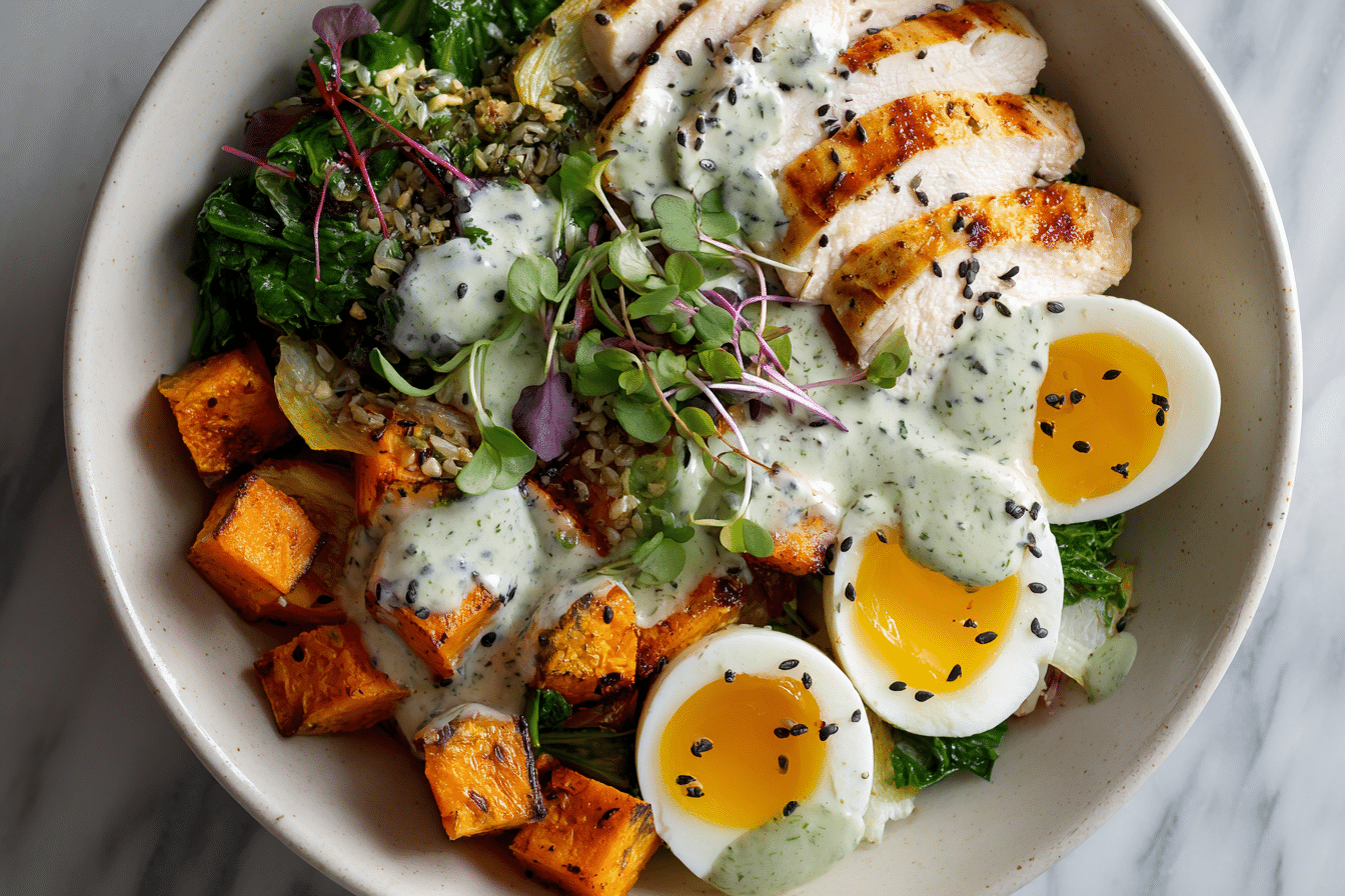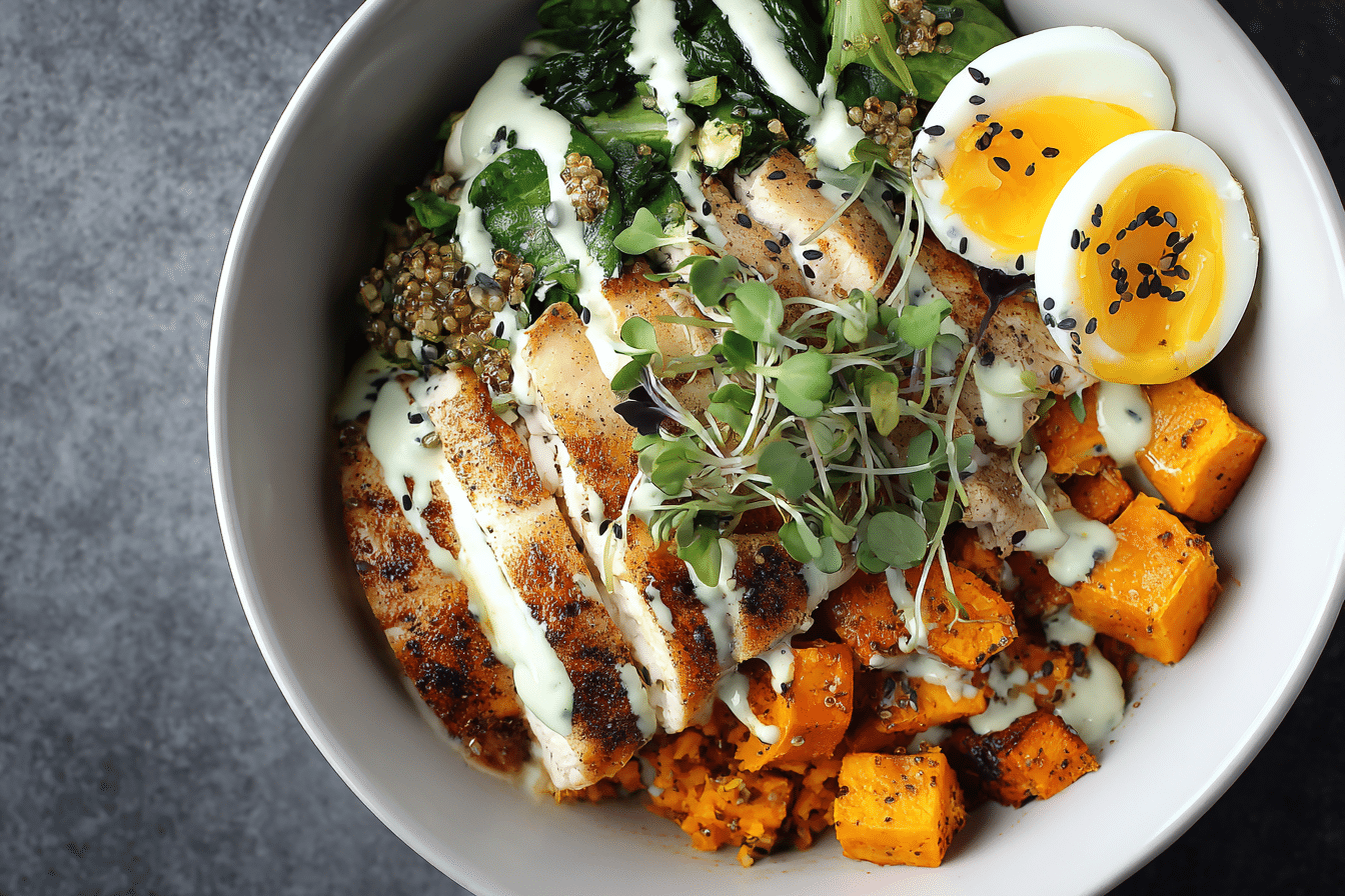Assemble bowls with roasted sweet potatoes, chicken, eggs, and avocado.