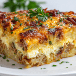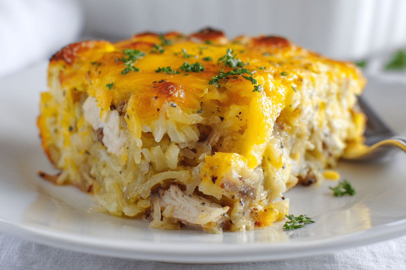A satisfying breakfast casserole featuring chicken, shredded hash browns, eggs, and cheddar cheese. Perfect for weekends, holidays, or prepping breakfast in advance.