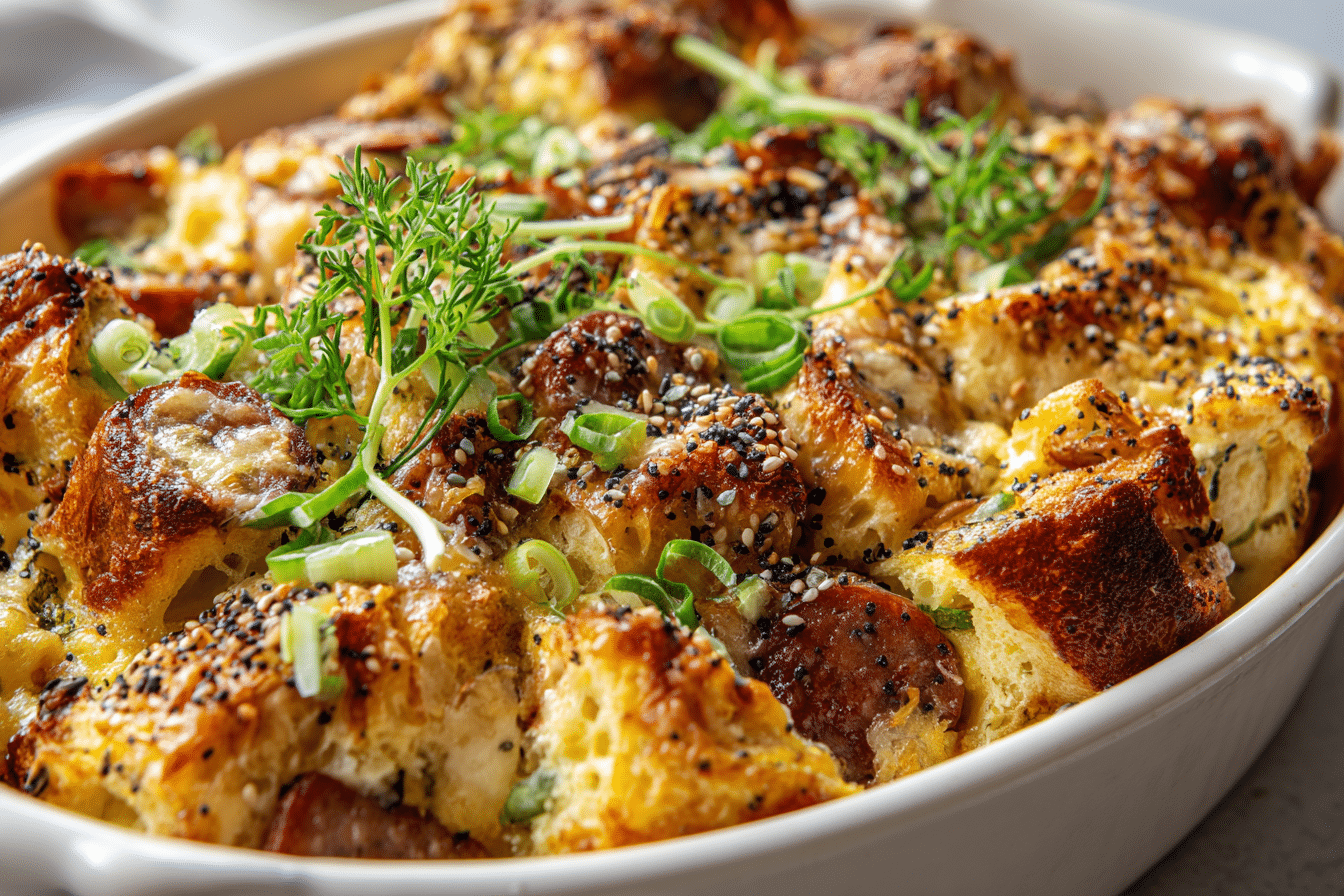 The foundation of this dish is a savory mix of everything bagels and chicken sausage, layered with eggs, cheese, and vegetables. It’s baked until golden, crispy on top, and custardy in the center. Each bite brings together the chewiness of bagels, the richness of eggs, and the bold seasoning of sausage. Whether served fresh out of the oven or reheated later in the week, this bake is always satisfying and convenient.