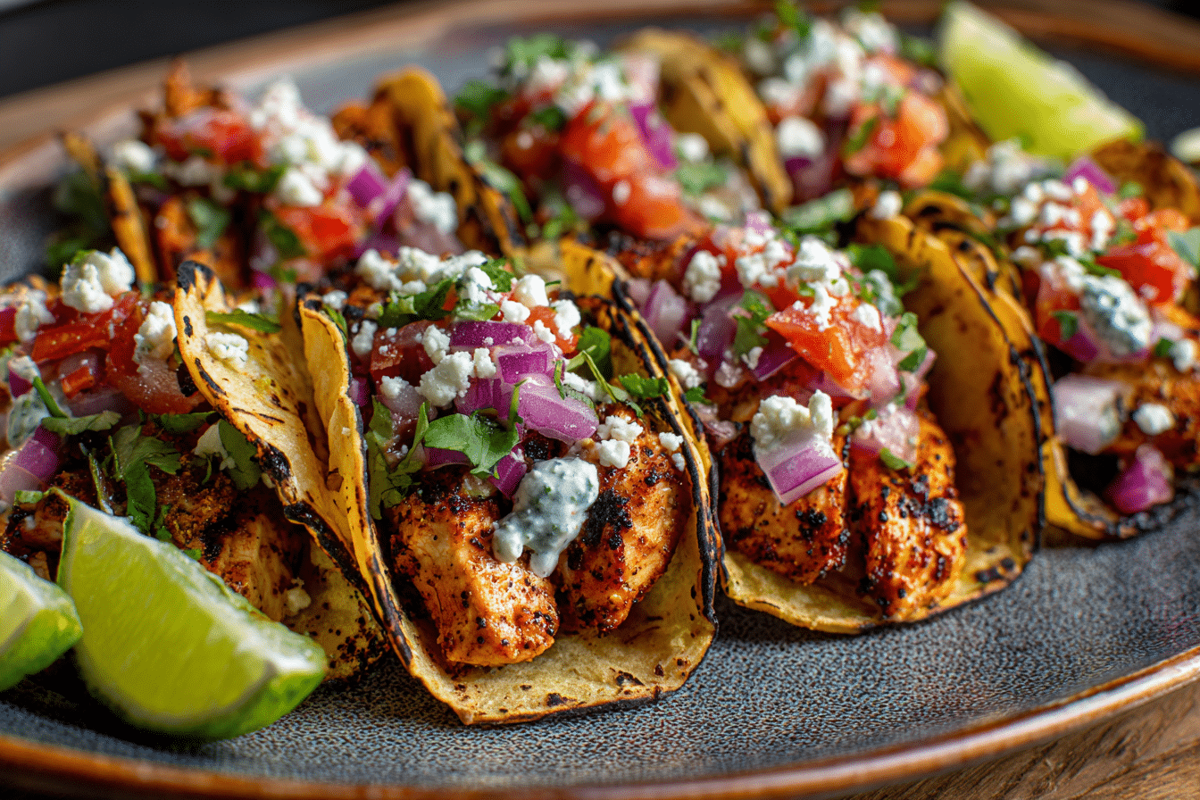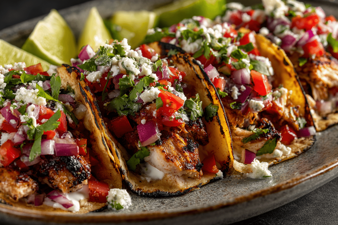 This version uses tender marinated chicken thighs grilled or pan-seared to perfection. They’re tucked into soft, lightly charred corn tortillas and finished with classic toppings like chopped onion, cilantro, salsa verde, or crumbled cotija cheese. The result is juicy, flavorful, and deeply satisfying with every bite.
