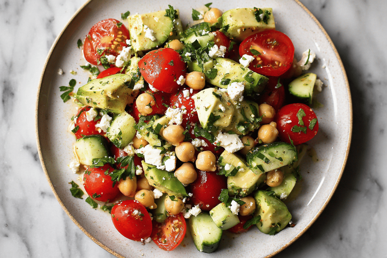 This salad is rich in plant-based protein from chickpeas and healthy fats from avocado and olive oil. It is both filling and nutrient-dense.