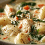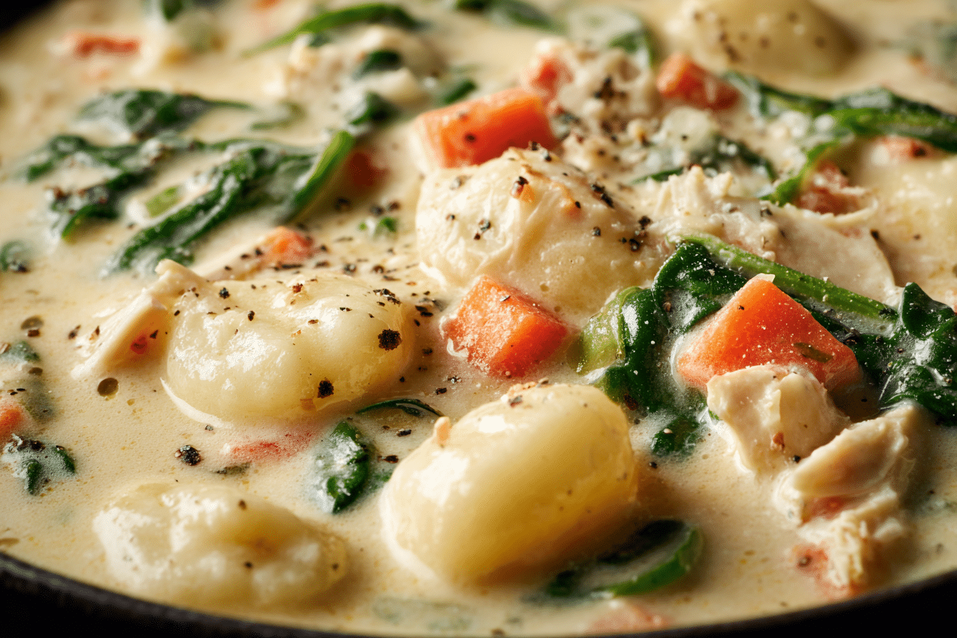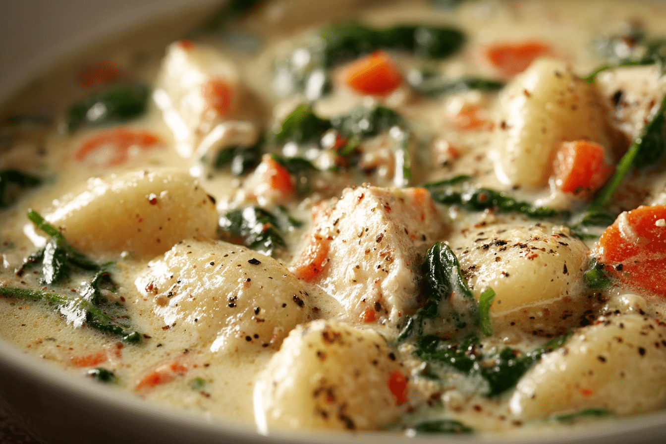 Soft gnocchi take the place of noodles, adding a pillowy bite to each spoonful. Shredded chicken brings warmth and protein, while the rich, garlicky broth—infused with cream and Parmesan—coats every ingredient in comforting goodness. With its velvety base and tender textures, this dish transforms a chilly evening into a comforting experience.