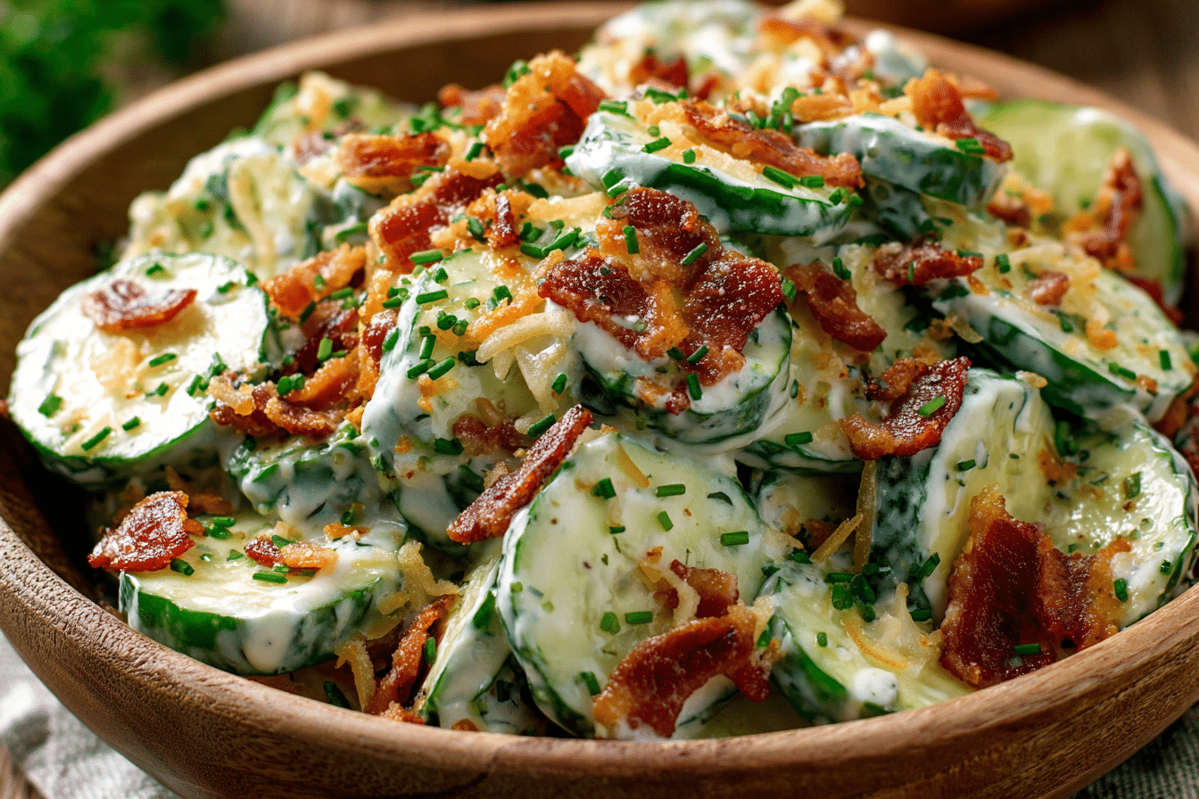 Creamy Cucumber Salad with Bacon and Cheese is a refreshing yet indulgent side dish that combines crisp cucumbers, savory bacon, and creamy cheese with a luscious dressing. This salad is perfect for summer barbecues, family dinners, or potlucks, offering a balance of crunch, creaminess, and savory flavor in every bite.
