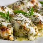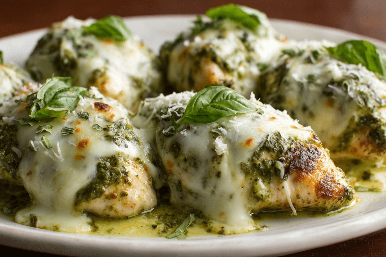 A creamy, cheesy baked chicken dish loaded with basil pesto, three cheeses, and a rich, smooth sauce — all baked to golden, bubbling perfection.