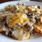 Whether you grew up eating something similar or it’s your first time trying it, there’s something deeply nostalgic about a casserole like this. Layers of ground beef, thinly sliced potatoes, onions, and creamy soup slowly melt together until fork-tender and full of flavor. Every bite is soft, satisfying, and deliciously familiar.