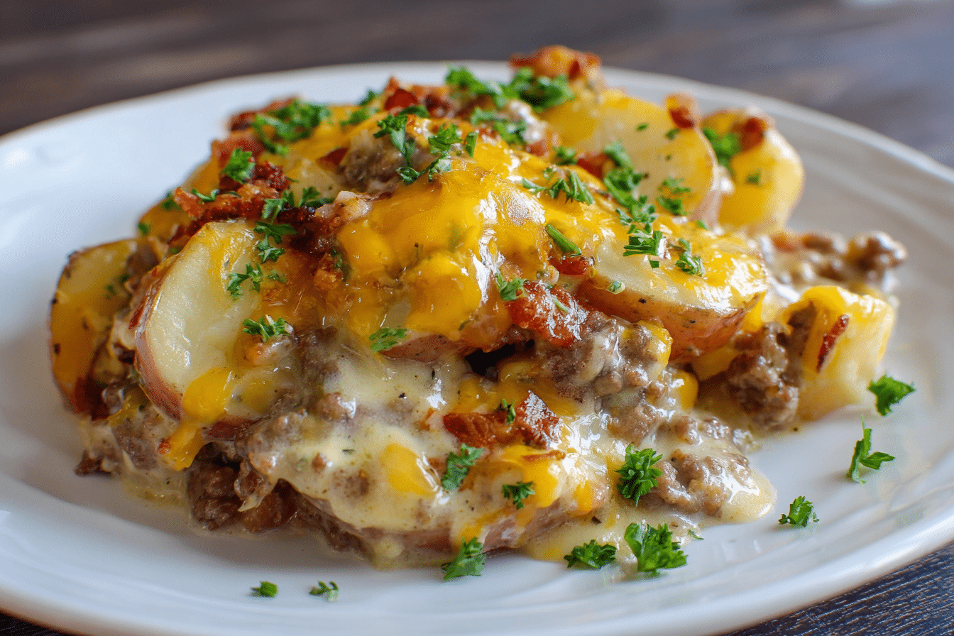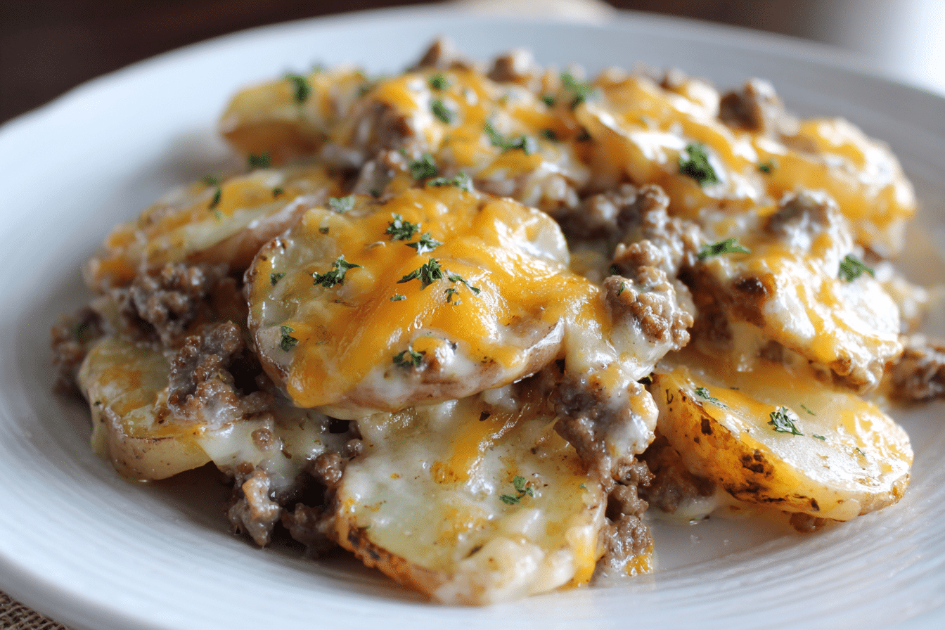 A comforting, layered crockpot casserole made with ground beef, sliced potatoes, onions, creamy soup, and melted cheese. Slow-cooked to tender perfection for a hearty family dinner.