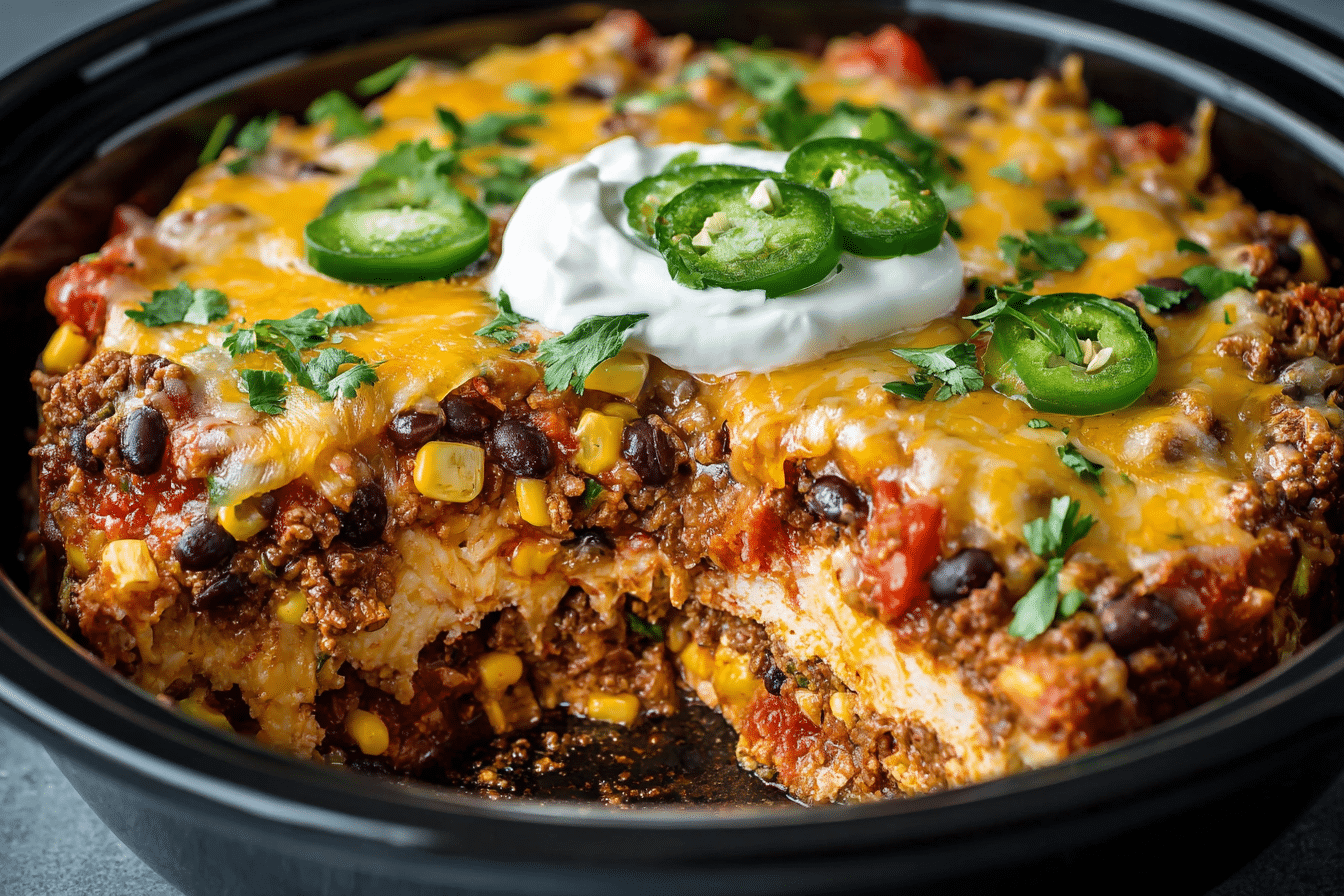 This Crockpot Taco Casserole is a hands-off, flavor-packed dinner perfect for busy weeknights or meal prep. Ground beef or turkey simmers with Mexican spices, beans, corn, and cheese, layered with tortillas or tortilla chips for a cheesy, hearty casserole that everyone will love.