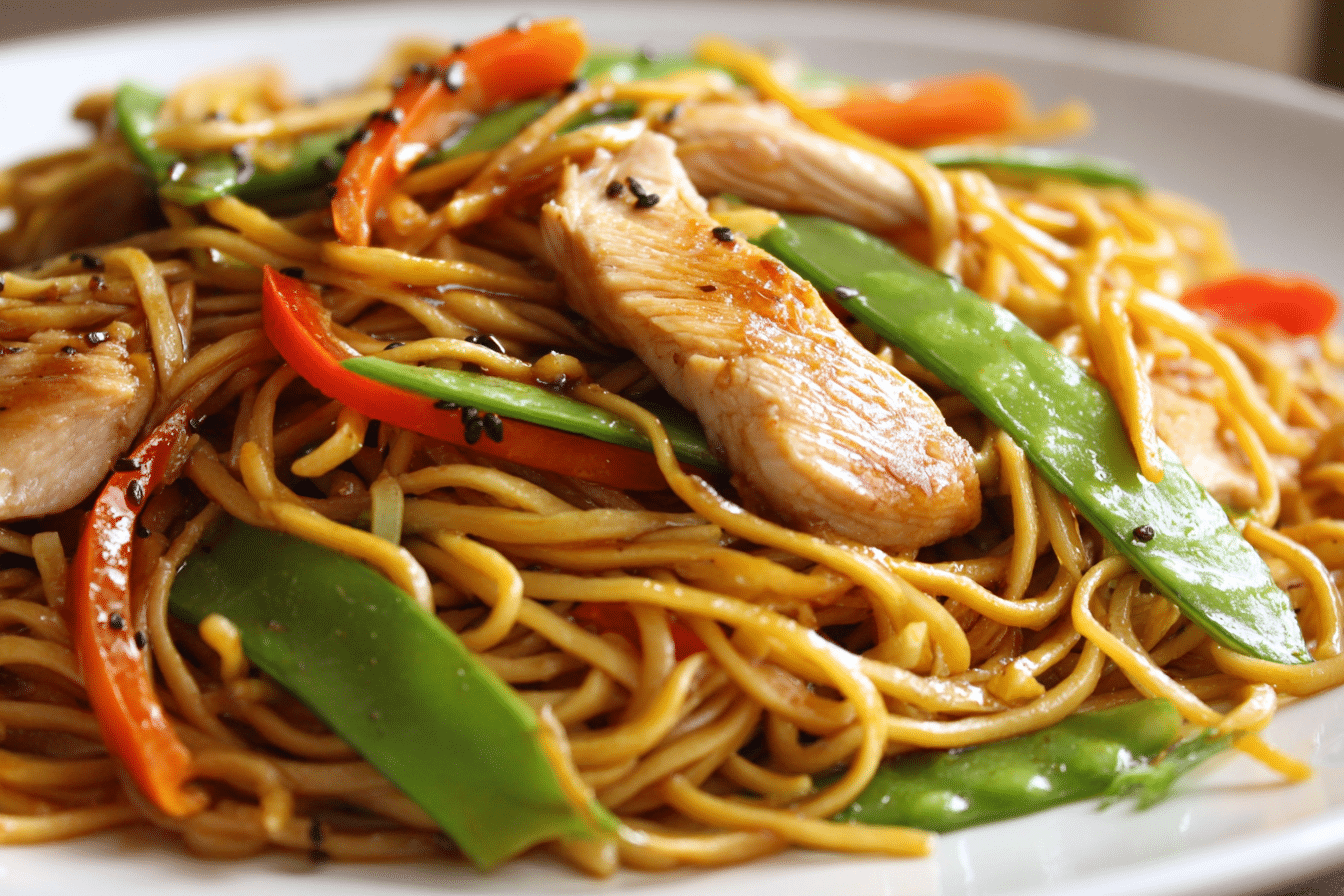 A quick, delicious stir-fried noodle dish with tender chicken, colorful veggies, and a savory soy-based sauce — your go-to takeout-style dinner at home.