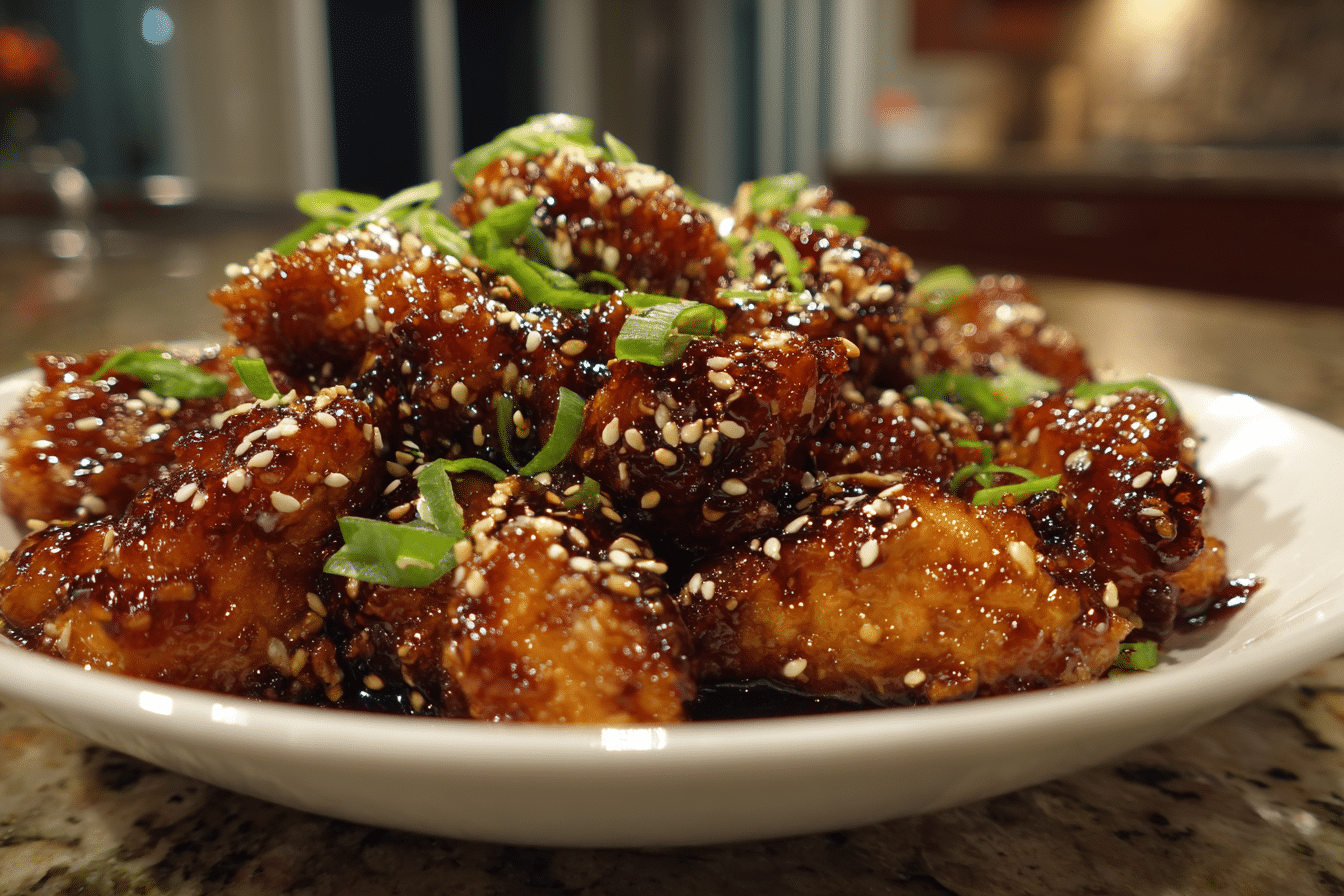The chicken is lightly coated and pan-fried or baked until golden, then tossed in a sticky sauce that clings to every bite. The result is a balance of sweetness, saltiness, and nutty sesame flavor that feels comforting and satisfying.