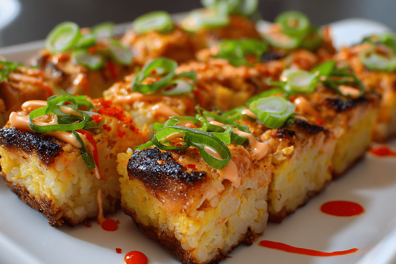 PrintThis easy spicy salmon sushi bake layers seasoned rice, creamy sriracha salmon, and crunchy toppings into a warm, sushi-inspired casserole — no rolling required.