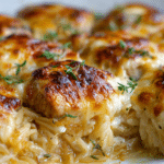 French Onion Chicken Orzo Casserole is the kind of meal that brings everyone to the table — bubbling cheese, golden orzo, and tender bites of chicken nestled in a deeply savory broth kissed with caramelized onions. Imagine everything you love about French onion soup reimagined as a creamy, satisfying weeknight casserole.