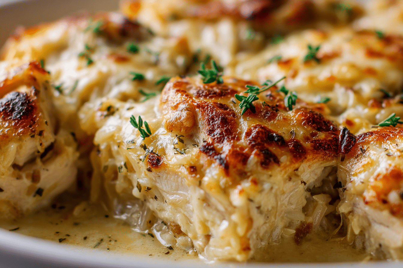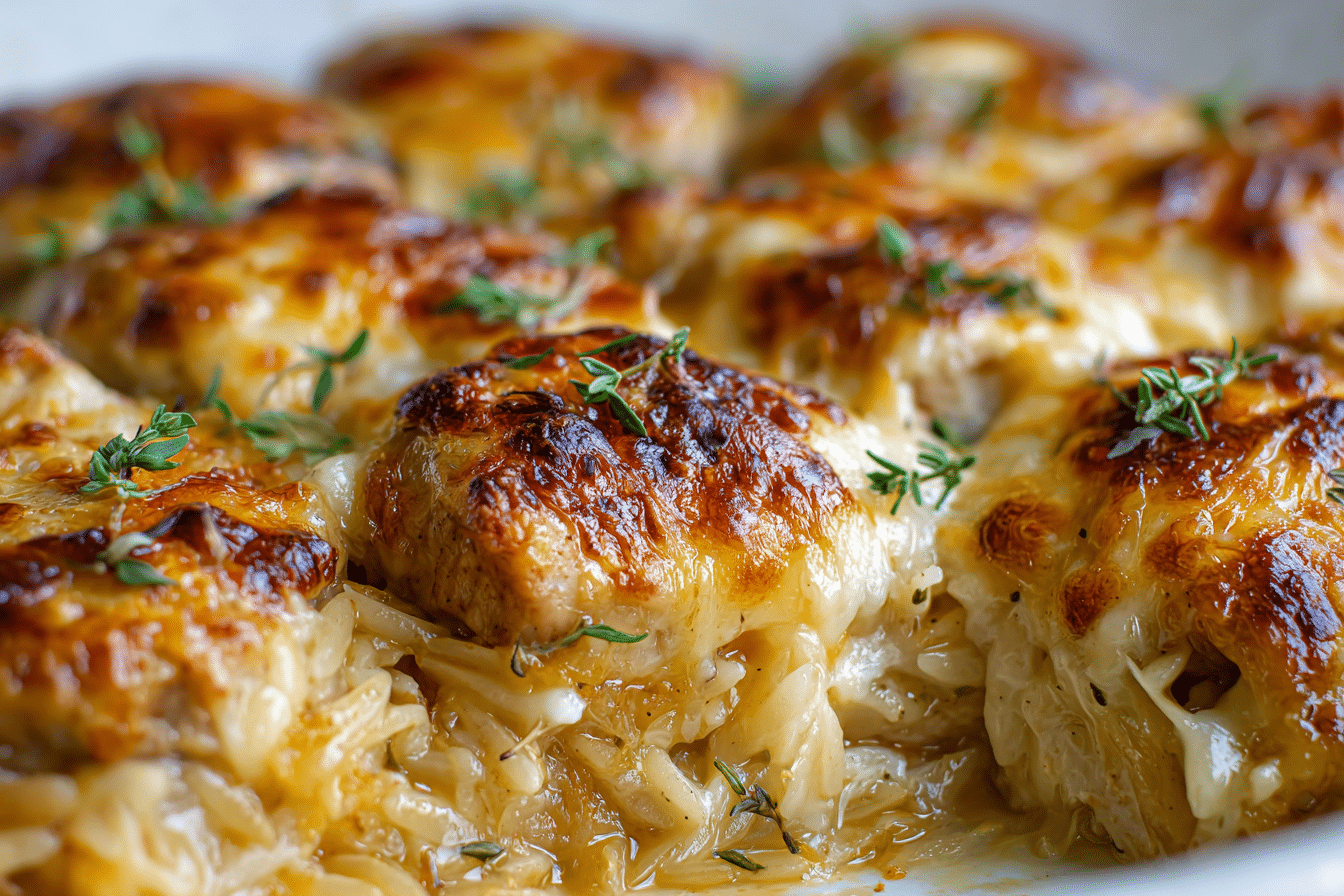 PrintA comforting, cheesy one-pan bake with the savory depth of French onion soup, tender chicken, and golden orzo pasta.
