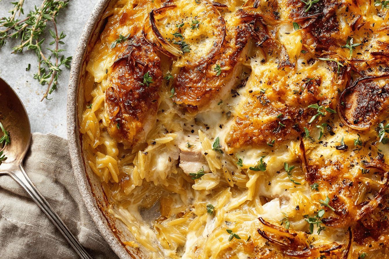 French Onion Chicken Orzo Casserole is a creamy, cheesy, and comforting dish that combines tender chicken, caramelized onions, and orzo pasta in a rich French onion-inspired sauce. This casserole delivers all the flavors of classic French onion soup—savory, sweet, and deeply satisfying—transformed into a hearty, oven-baked meal perfect for weeknight dinners or family gatherings.
