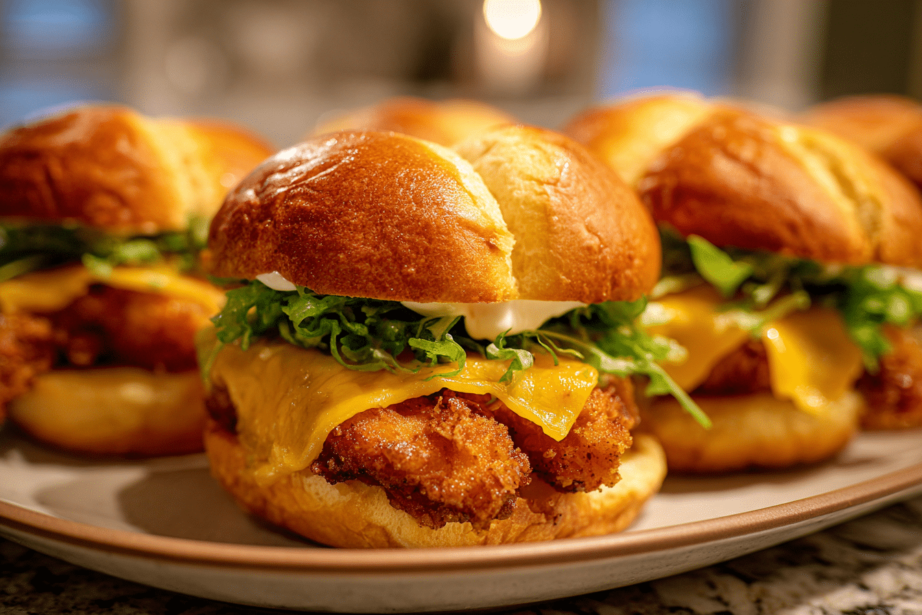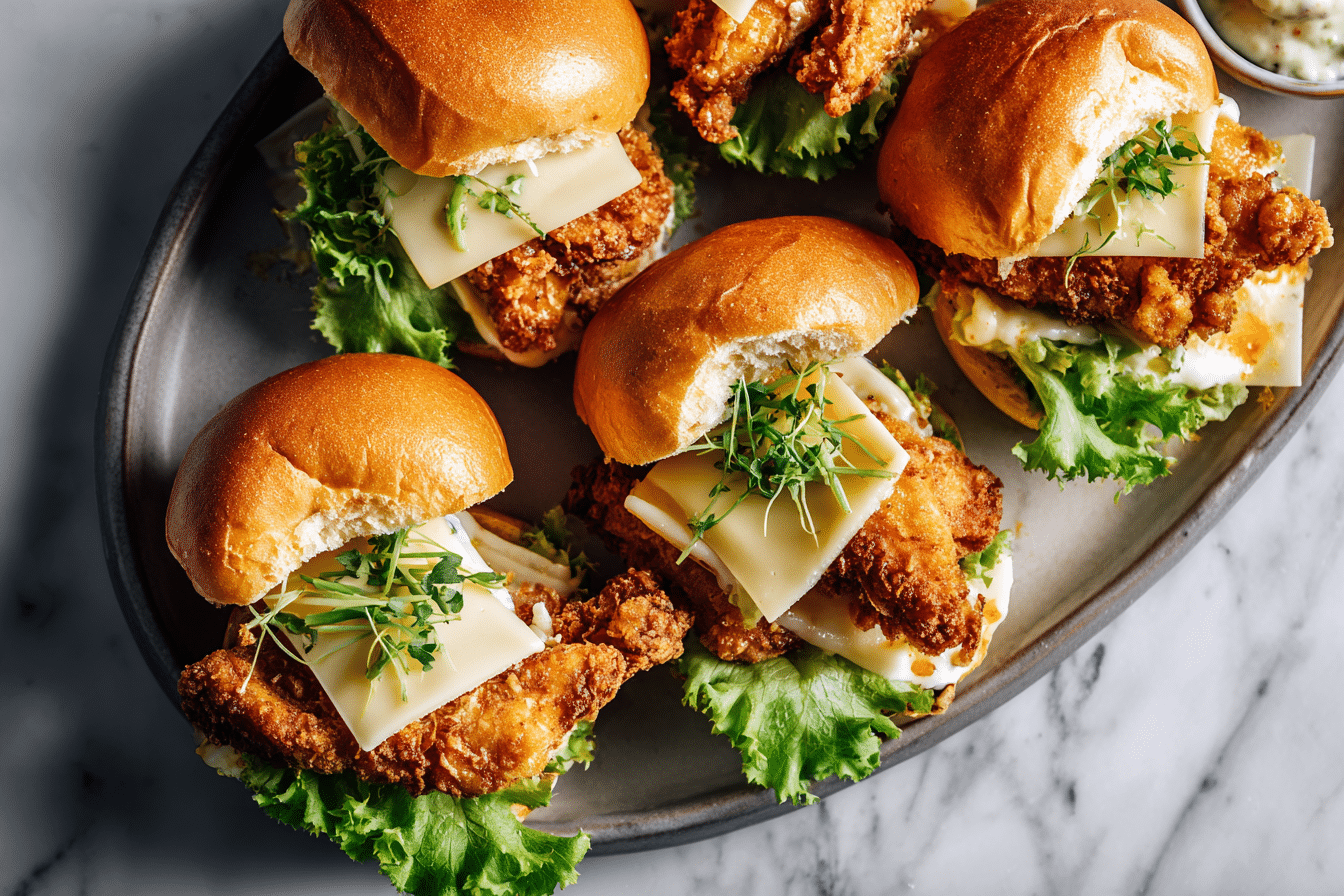 Soft buns filled with crispy fried chicken and melted cheese create a warm, satisfying meal that works well for lunch, dinner, or casual gatherings. The contrast between crunchy chicken and fluffy bread makes each bite rich in texture while still easy to enjoy.