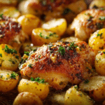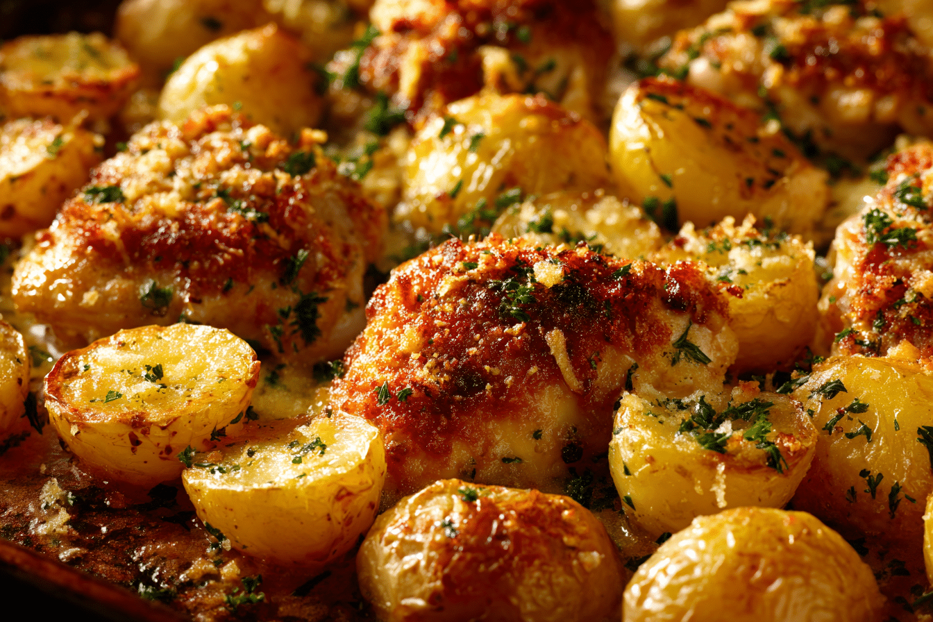 There’s something undeniably comforting about roasted chicken and potatoes — it’s a timeless combo that never goes out of style. This Garlic Parmesan Chicken & Potatoes recipe is a flavorful, oven-baked one-pan dish that brings together crispy, juicy chicken, golden potatoes, and a buttery garlic-parmesan coating that will have everyone reaching for seconds.