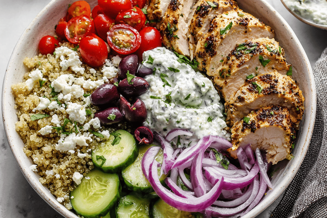 These Greek Chicken Bowls are a clean-eating favorite with grilled marinated chicken, fresh vegetables, whole grains, and creamy homemade tzatziki. Great for meal prep or light dinners.