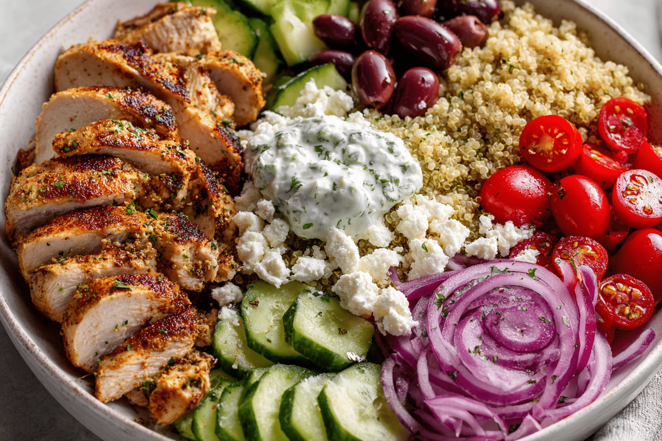 Greek Chicken Bowls are a delicious, nourishing way to enjoy Mediterranean flavors in a simple, balanced meal. Packed with lean protein, vibrant vegetables, fluffy grains, and creamy tzatziki, these bowls are perfect for clean eating and weekly meal prep.