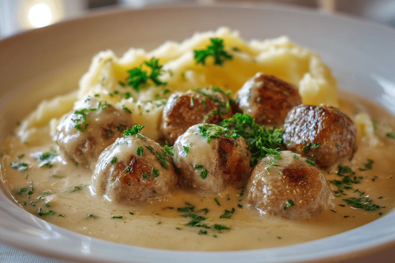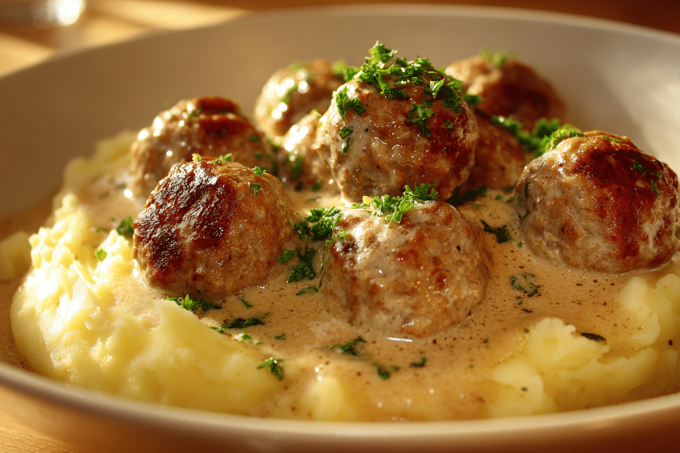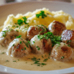 Hackbällchen in cremiger Sauce mit Kartoffelpüree, or German meatballs in creamy sauce with mashed potatoes, is one of those cozy, feel-good meals that brings everyone to the table. Juicy, tender meatballs are simmered in a rich, savory cream sauce and served over buttery, fluffy mashed potatoes — perfect for chilly evenings, family dinners, or just when you need something comforting and satisfying.