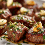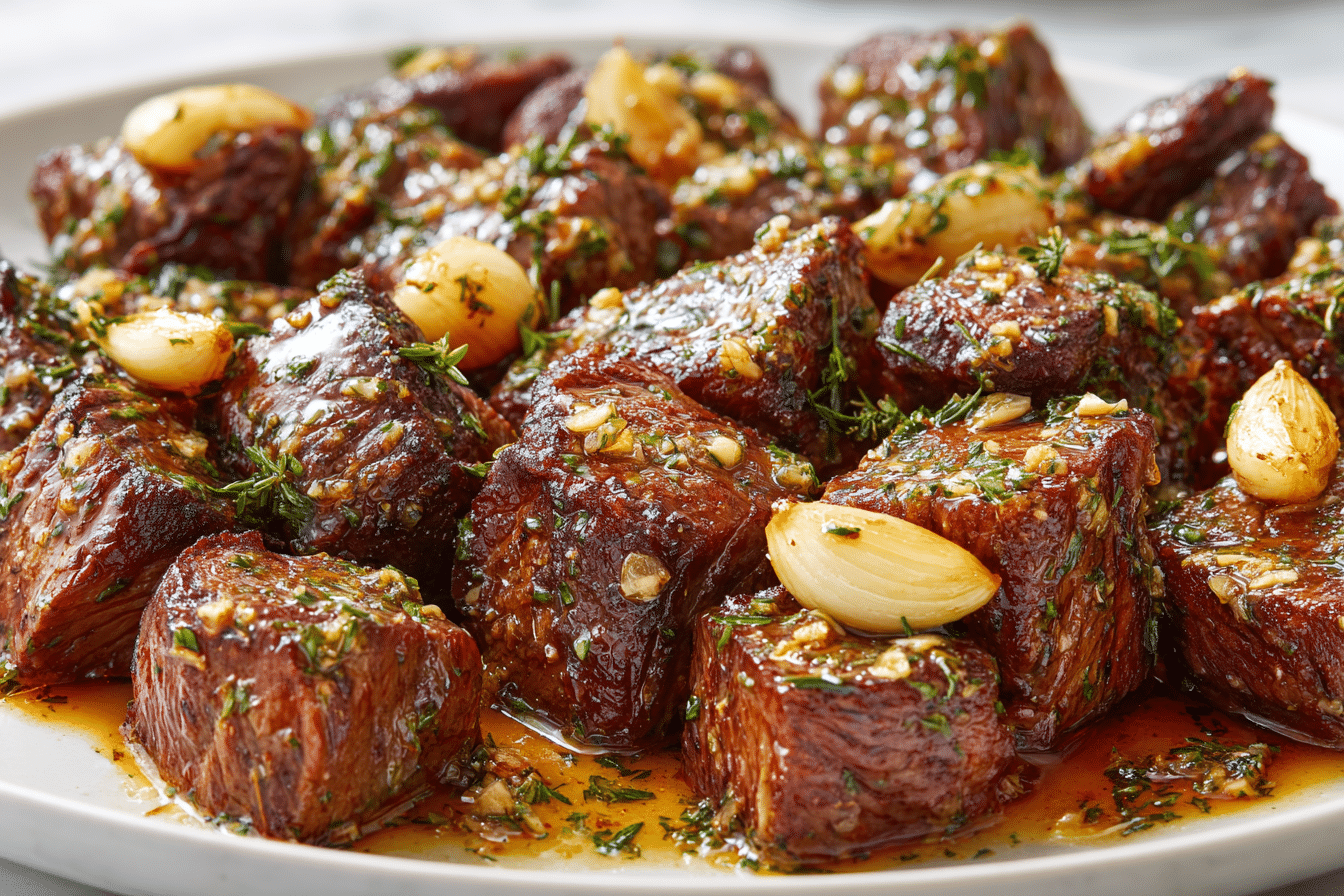 PrintTender garlic butter beef bites slow-cooked to perfection in a rich, savory sauce. High in protein, easy to make, and perfect for meal prep or weeknight dinners.