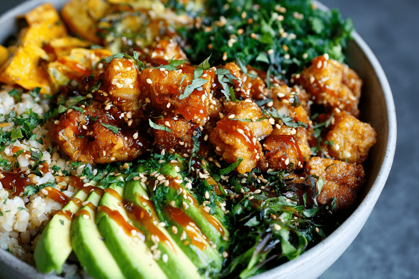 Yes, replace the chicken with roasted chickpeas, crispy tofu, or grilled halloumi. Toss your protein substitute in hot honey or a similar sweet-spicy sauce. The rest of the bowl components remain the same, creating a satisfying plant-based option.