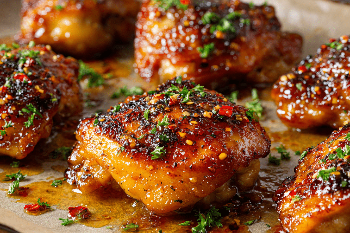 Crispy oven-baked chicken thighs brushed with a sweet, garlicky hot honey glaze. A bold, easy dinner packed with flavor and texture.