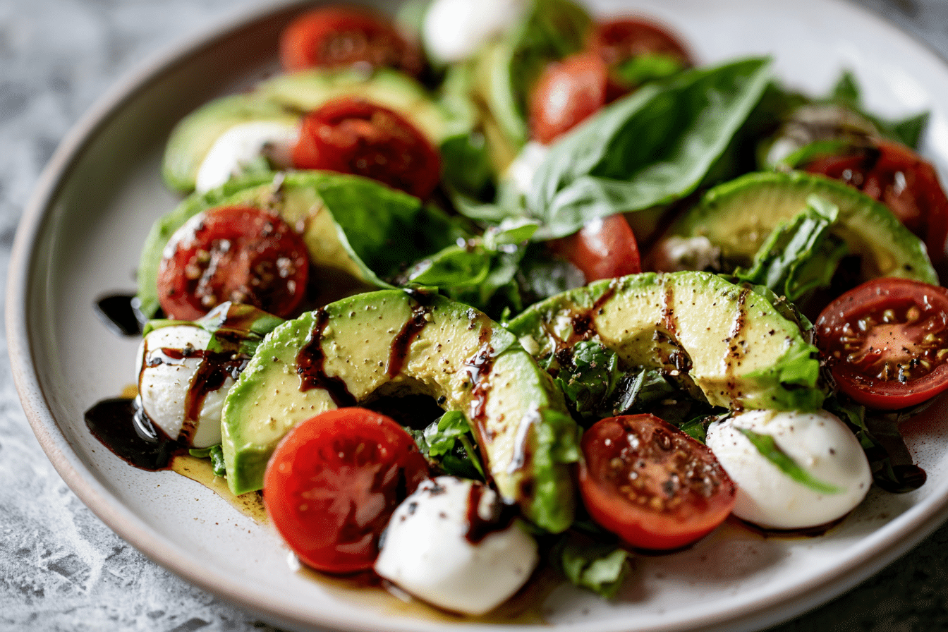Avocado is the ingredient that gives this caprese salad its unique twist. It adds a creamy, buttery texture that blends smoothly with the other fresh components. When ripe, avocado slices easily and holds its shape well in salads, creating a soft contrast to firmer ingredients like tomatoes.