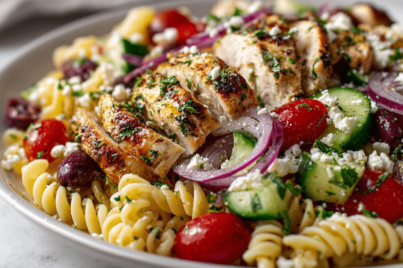 Mediterranean Chicken Pasta Salad combines tender chicken, pasta, fresh vegetables, olives, feta, and a lemon-olive oil dressing for a bright and satisfying meal.