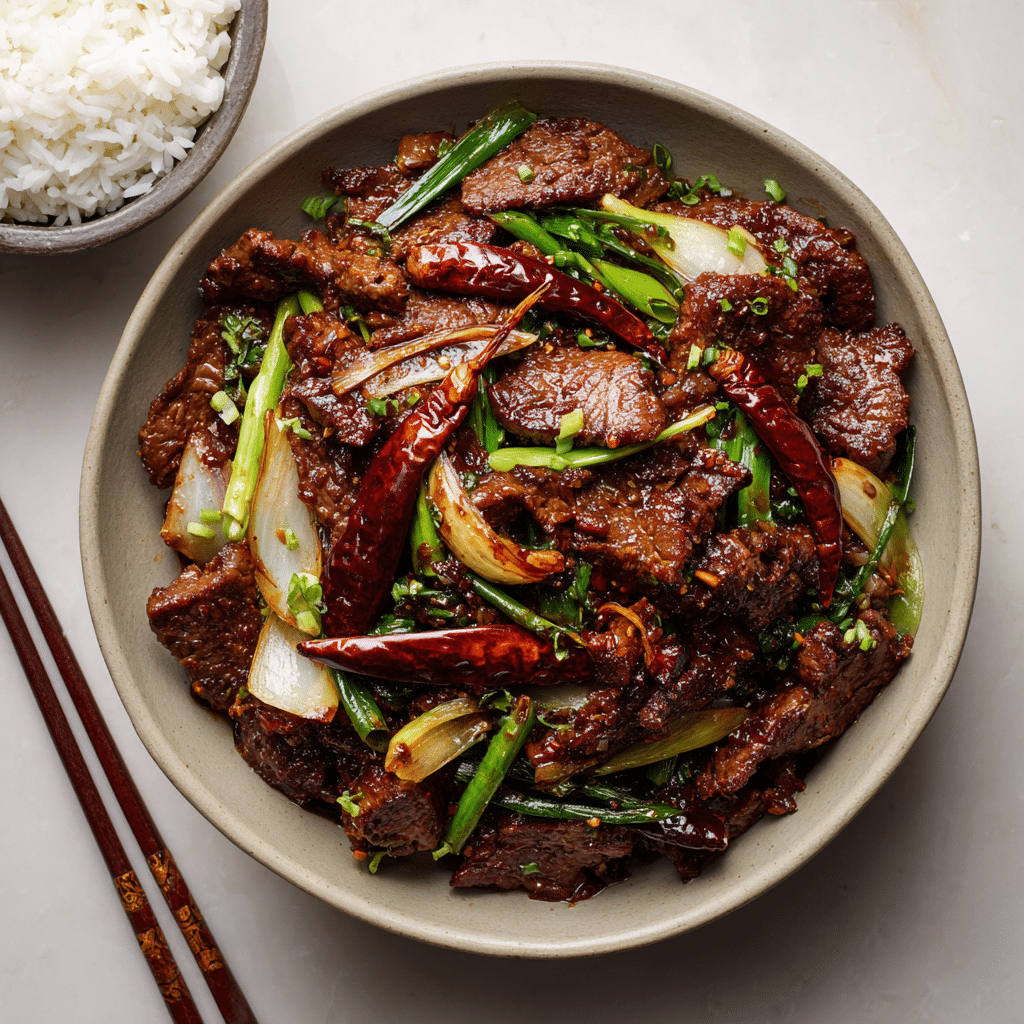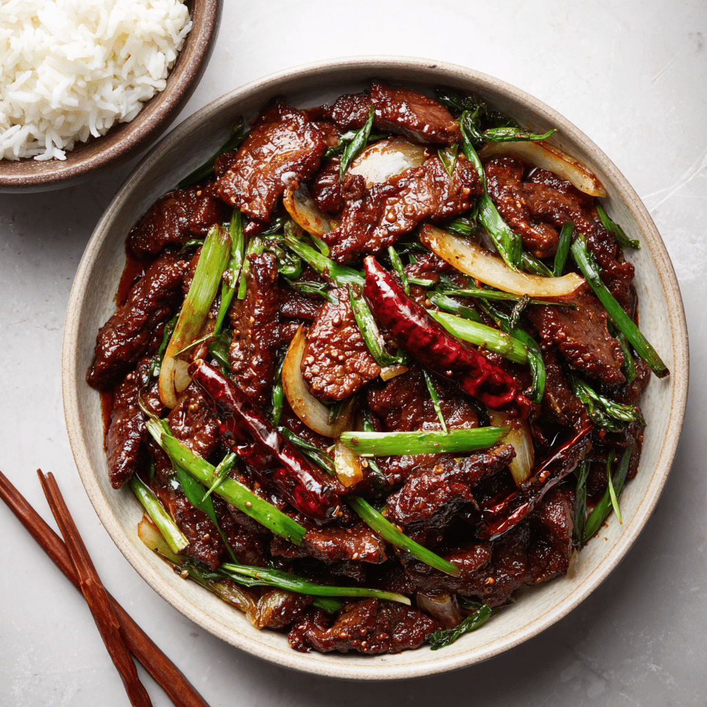 Mongolian Beef is a beloved Chinese-American dish featuring tender slices of beef coated in a sweet and savory soy-based sauce, often served over steamed rice or noodles. It’s known for its glossy, garlicky sauce and caramelized beef, typically stir-fried with scallions for a pop of freshness.