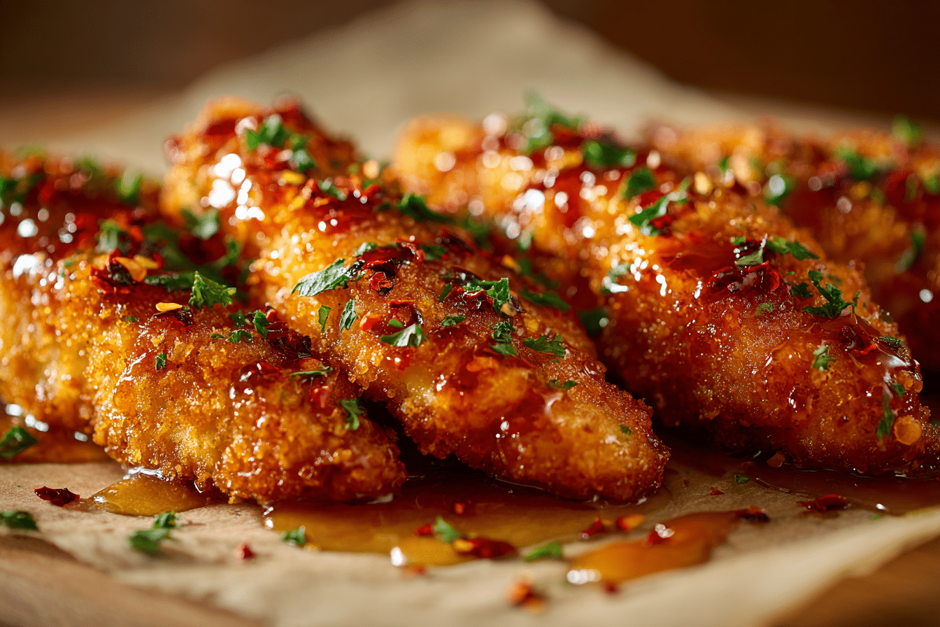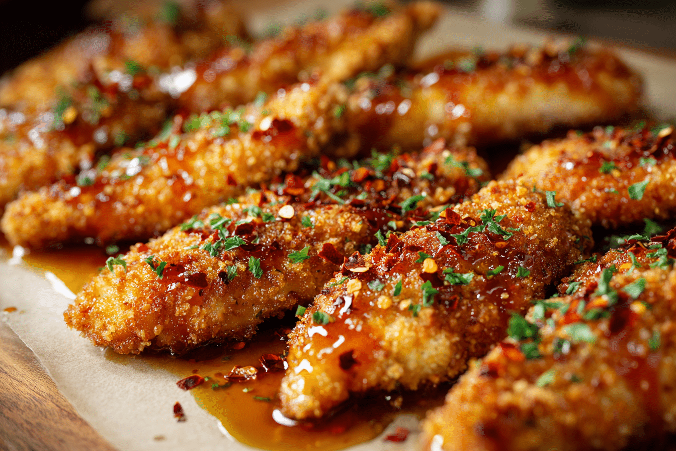 These oven-baked Nashville Hot Honey Chicken Tenders are spicy, sweet, and crispy with a sticky hot honey glaze. A no-fry version of the Southern favorite, perfect for dinners, parties, or casual bites.