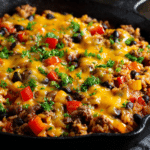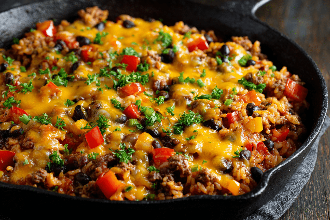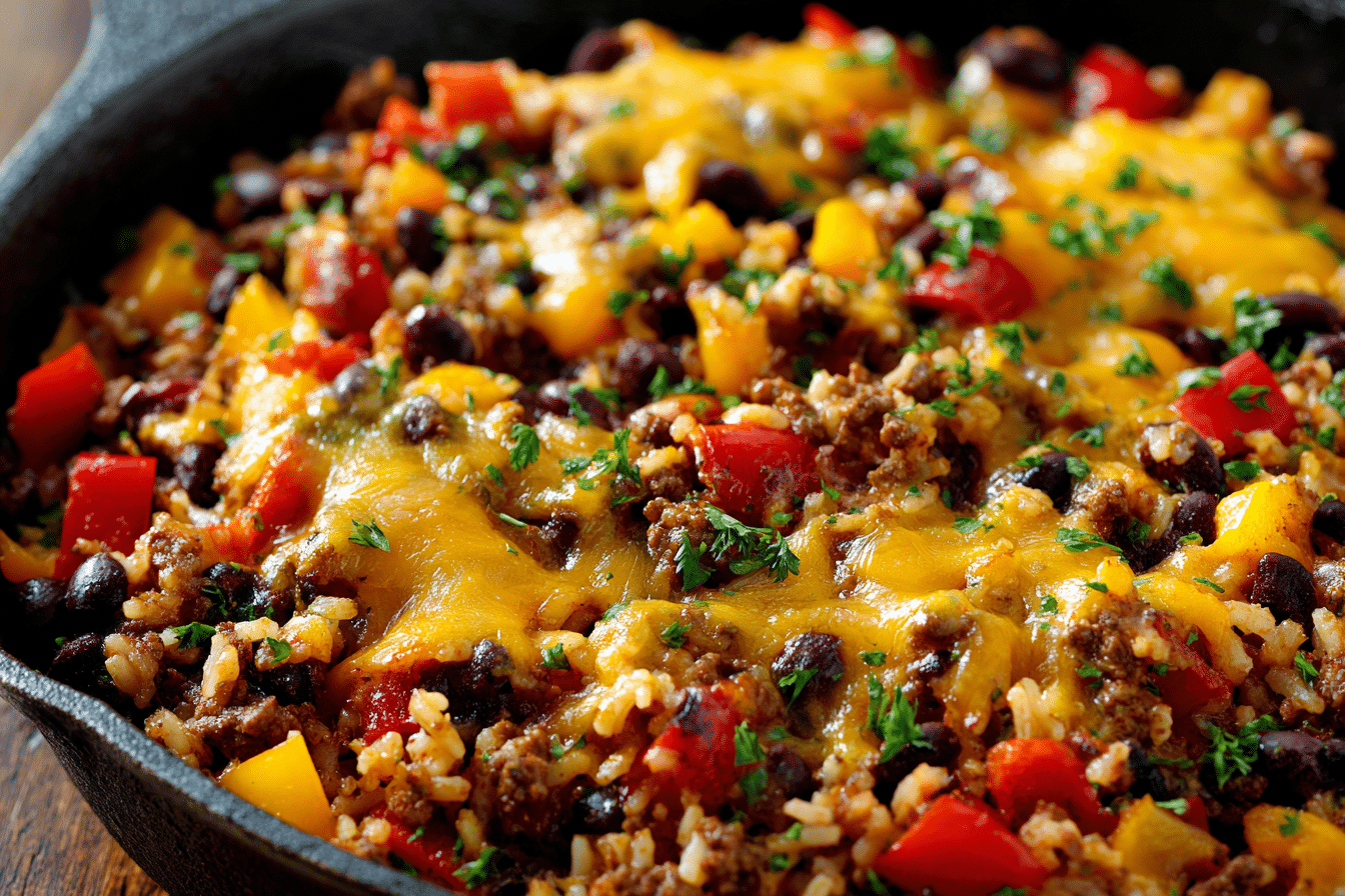 This beef skillet offers a balanced mix of macronutrients—protein from the beef, fiber from the peppers and rice, and fats from the cheese and olive oil. Bell peppers add vitamin C and antioxidants, while rice provides long-lasting energy.