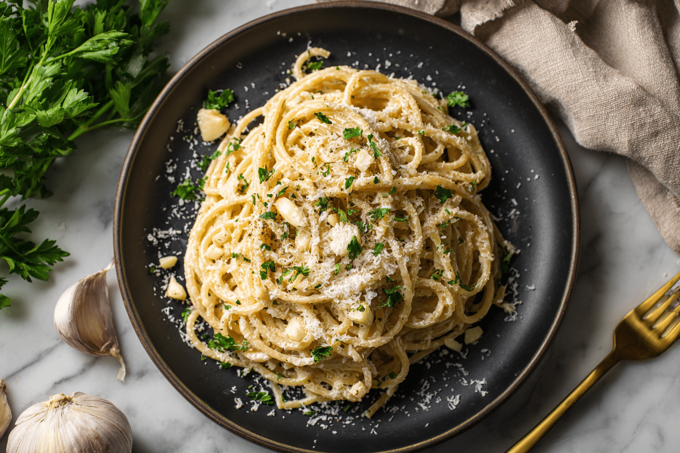 Heavy cream is added toward the end of cooking to create the signature creamy texture. It softens the intensity of the garlic and broth while giving the sauce a velvety finish. For a lighter version, half-and-half can be used.