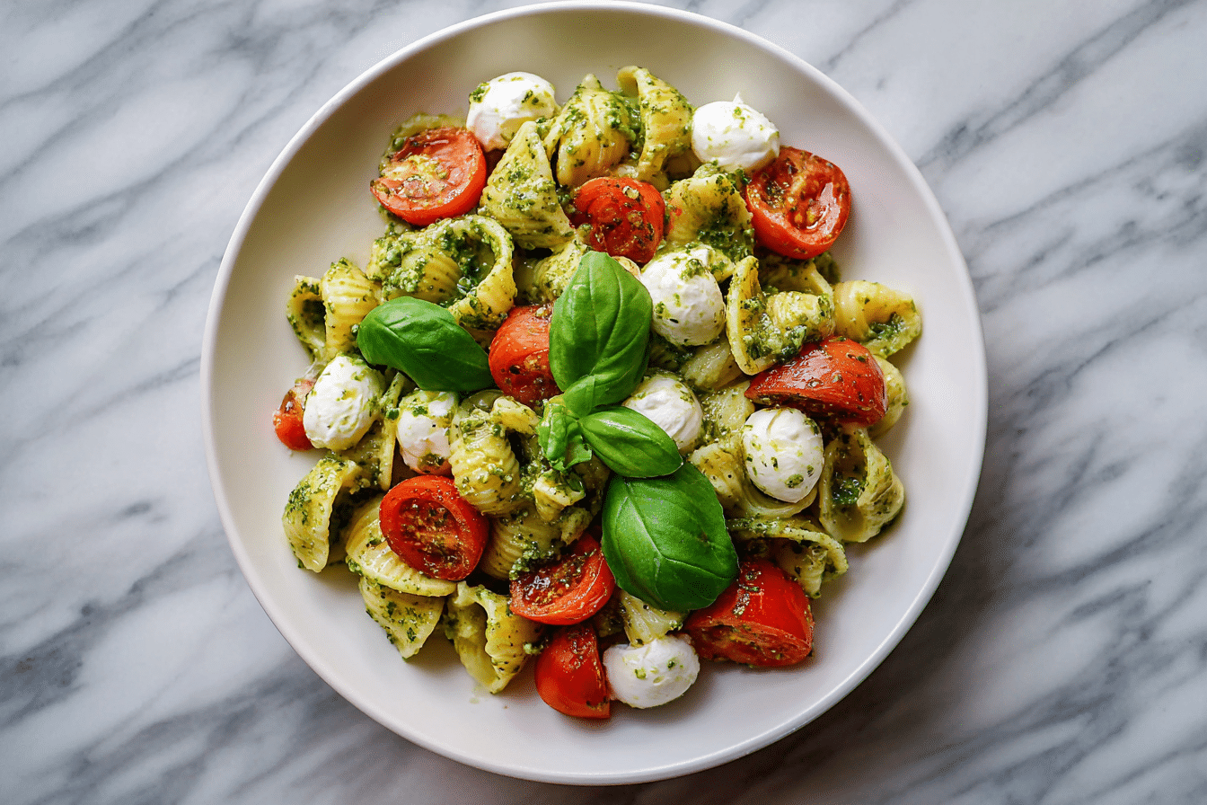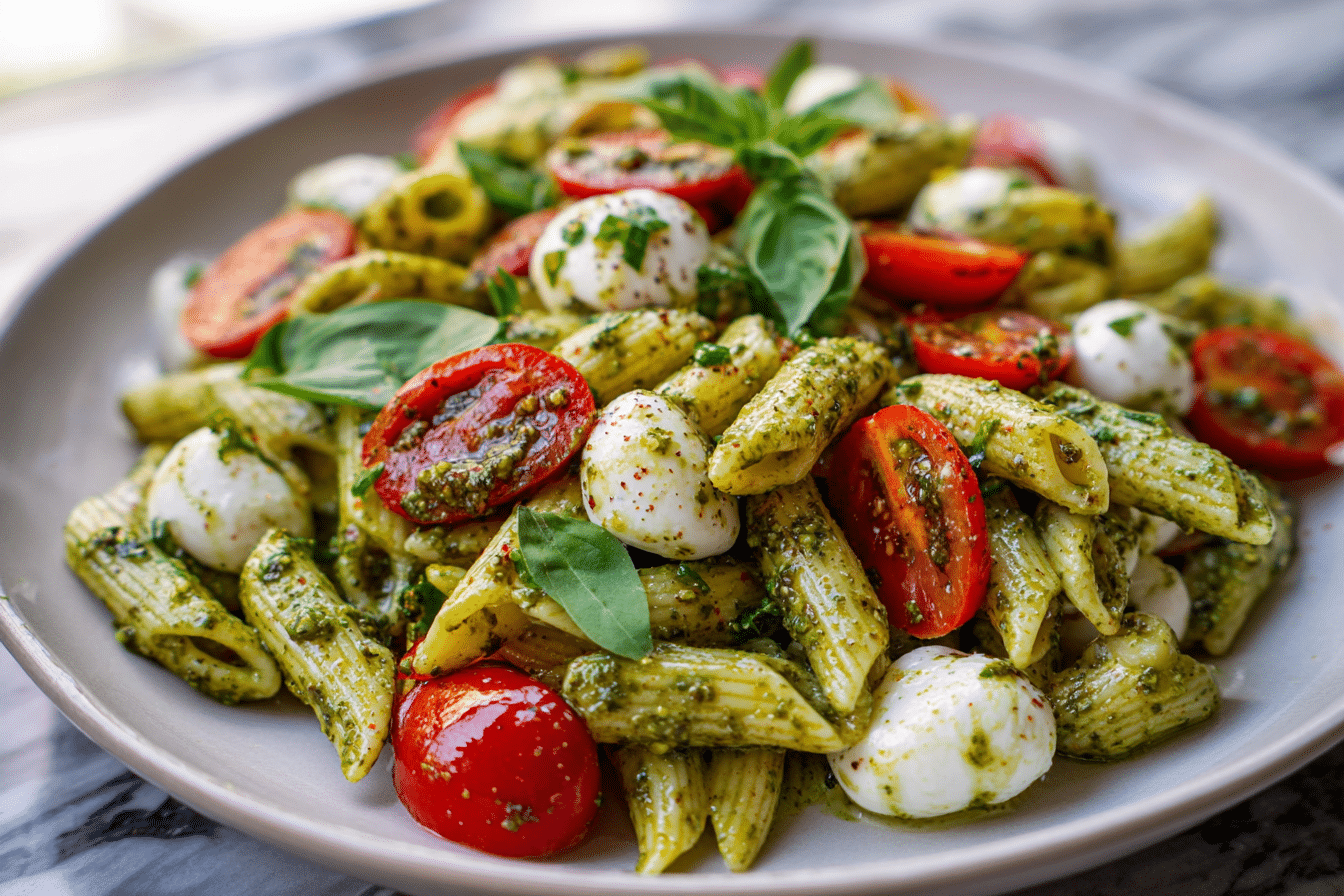 This Pesto Pasta Salad with Tomatoes & Mozzarella is a vibrant, refreshing dish packed with herby pesto, juicy tomatoes, creamy mozzarella, and perfectly cooked pasta. Itβs quick, easy, and perfect for BBQs, meal prep, or summer lunches.