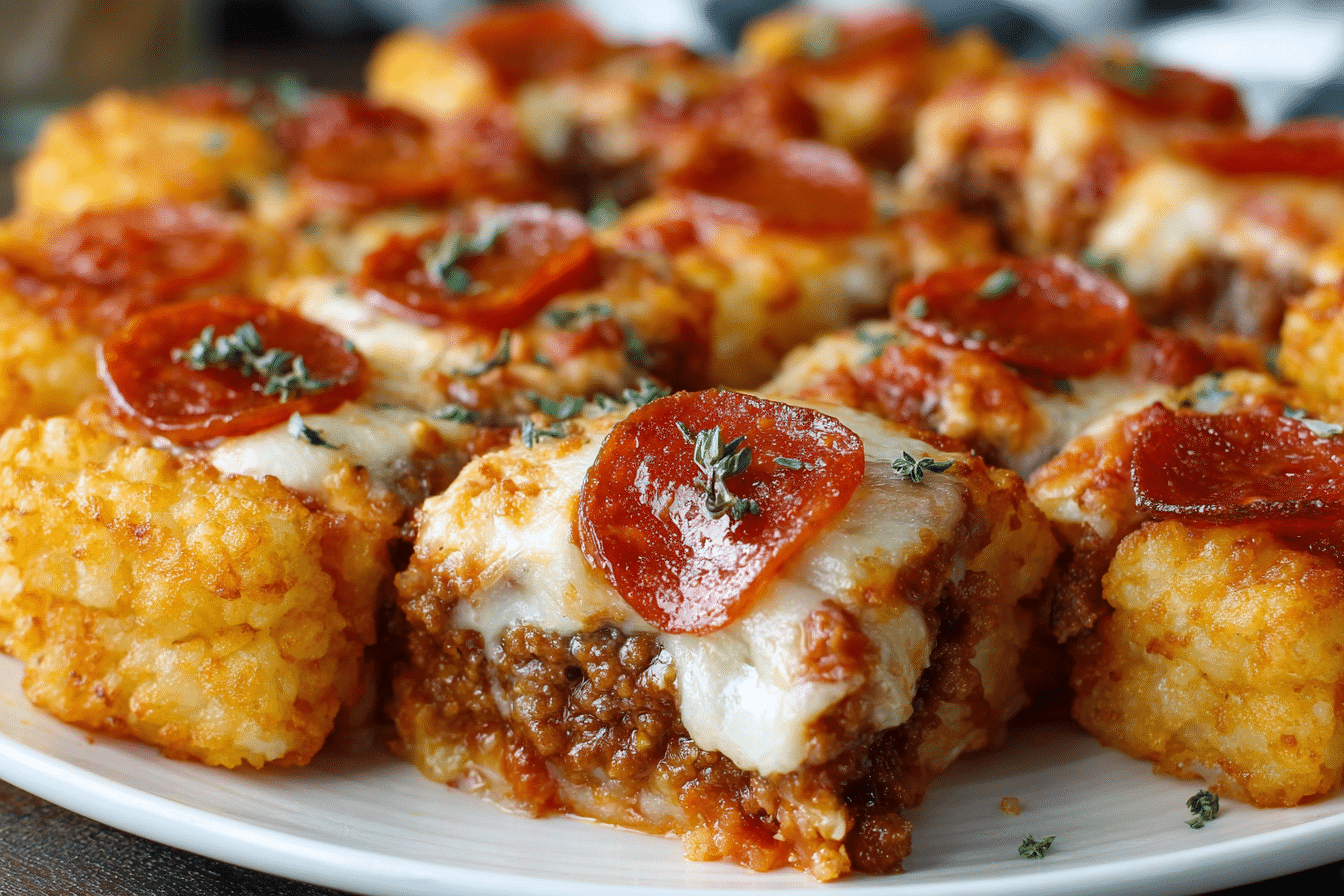 Imagine a saucy base of seasoned ground beef or sausage, melty mozzarella, pepperoni slices, and crispy golden tater tots layered on top like a crunchy crown. It’s everything you love about pizza in a fun, forkable form — no dough needed. Plus, it’s wildly customizable, budget-friendly, and guaranteed to win smiles from kids and adults alike.