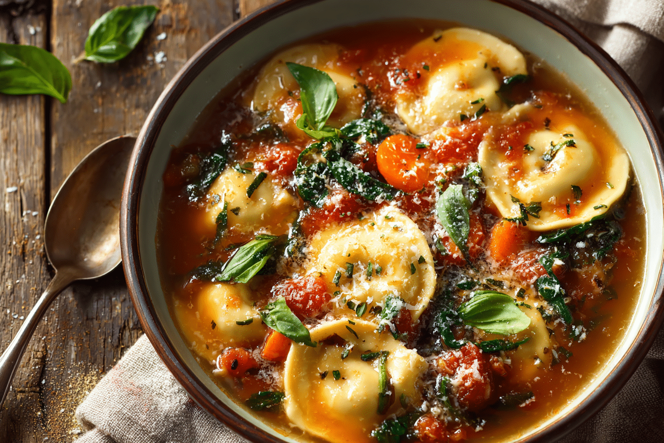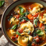 This recipe features tender cheese or meat-filled ravioli simmered in a rich tomato-based broth with vegetables and Italian herbs. Each spoonful delivers the perfect bite of soft pasta, warm broth, and nourishing veggies — a complete meal that feels both rustic and indulgent.