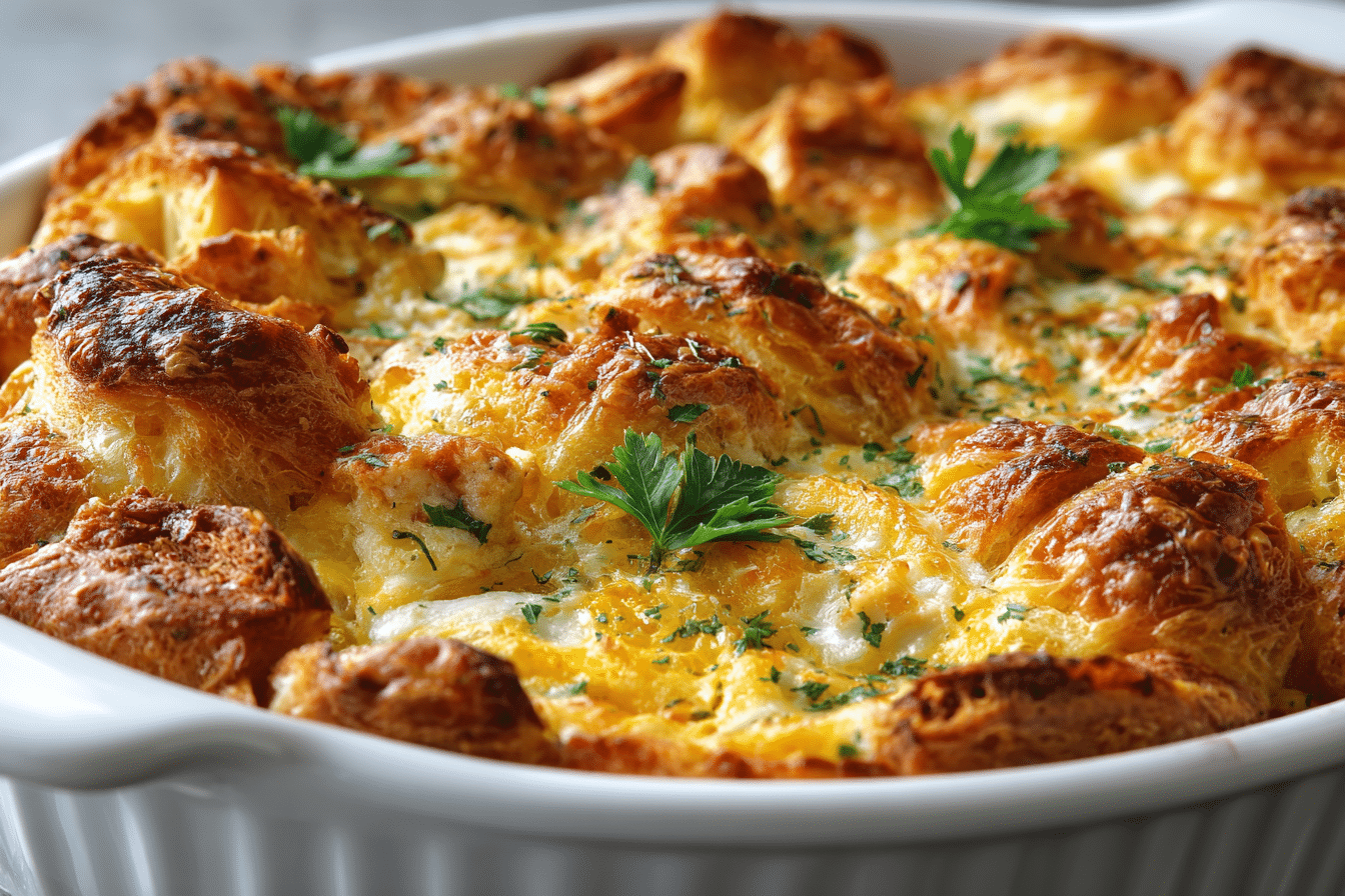 A rich and savory breakfast casserole featuring buttery croissants, shredded chicken, eggs, and cheese. Great for weekend brunches or make-ahead meals.