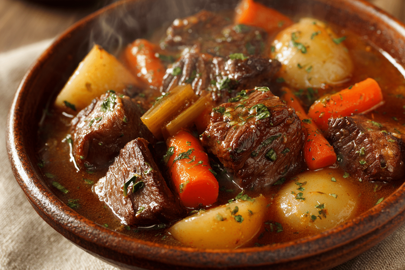 Onions and garlic form the aromatic base. Yellow onions soften and lend mild sweetness, balancing the savory beef. Fresh garlic adds depth without overpowering the stew.