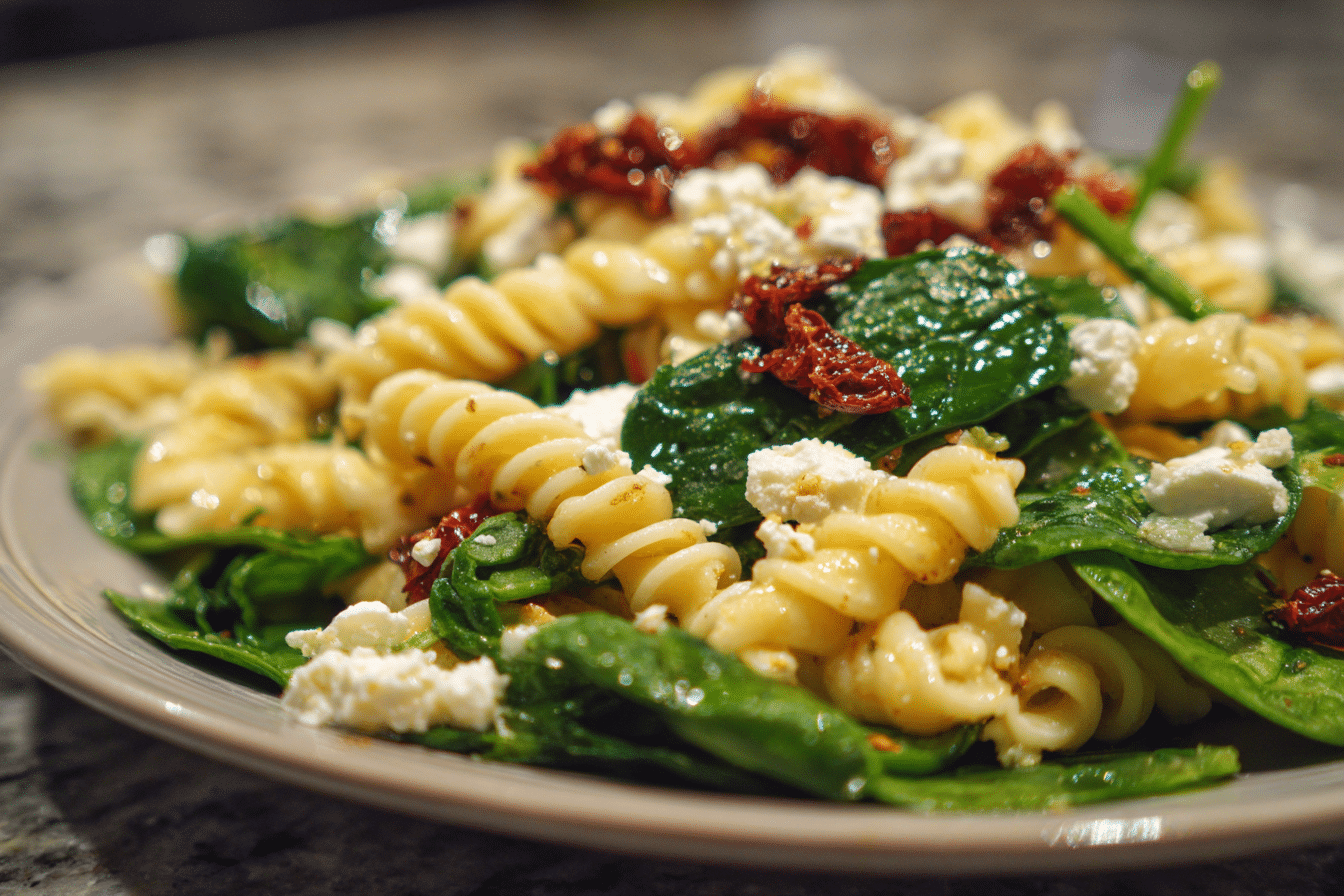 - In a large bowl, combine pasta, spinach, sun-dried tomatoes, feta, and onion.